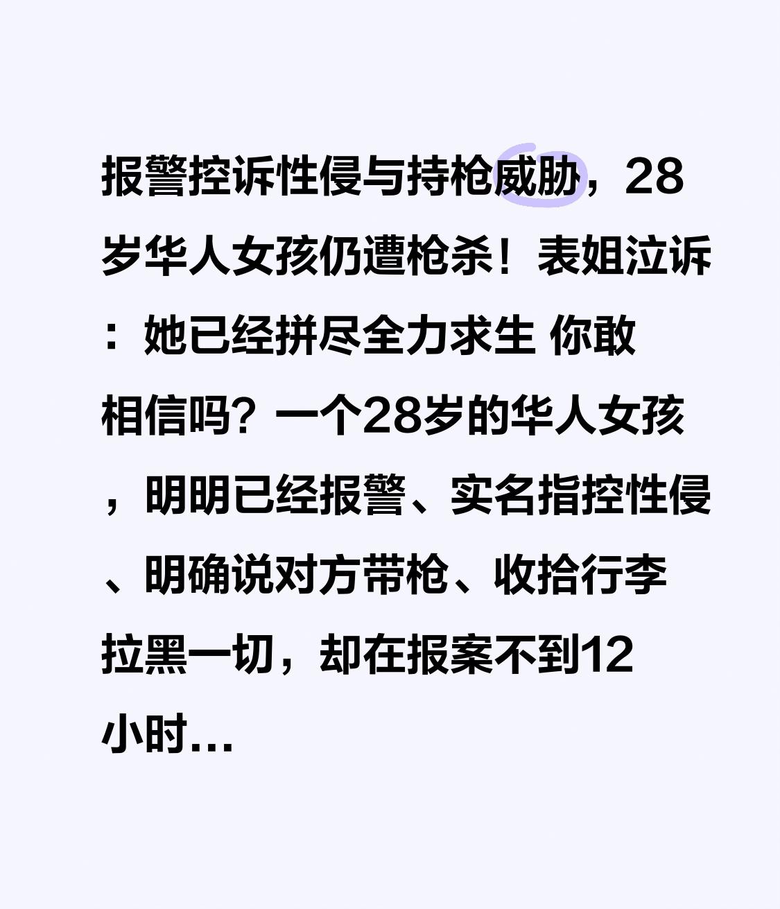 报警控诉性侵与持枪威胁,28岁华人女孩仍遭枪杀!表姐泣诉:她已经拼尽全力求生 你敢相信吗?一个28岁的华人女孩,明明已经报警、实名指控性侵、明确说对方带枪、收拾行李拉黑一切,却在报案不到12小时,被前男友残忍枪杀。 当地时间2月8日,美国宾州噩耗传来:华人女孩卢媛媛,在车内头部中枪身亡。凶手是她的前男友任宇俊,作案后带律师自首,还无耻狡辩“枪走火”,只想吓唬她。 案发前一晚,媛媛鼓起所有勇气走进警局。她清晰告诉警方:自己当天遭性侵,长期被跟踪骚扰,对方随身带枪,她极度恐惧、生命受威胁。她配合取证、做完笔录,拉黑对方、收拾好行李,决心彻底逃离。她以为报警就是护身符,却没想到,求助没能换来保护,反而让恶魔更快下了死手。 监控拍下绝望一幕:凶手凌晨一路尾随,在她准备开始新生活的时刻,扣动了扳机。父亲刚回国探亲,转眼天人永隔;家人还在等她平安消息,等来的却是死讯。表姐含泪发声:她善良、懂事、从不添麻烦,忍了很久才敢求救,她已经拼尽全力求生,可还是没能活下来。 更让人意难平的是,这不是冲动犯罪,是蓄谋已久的伤害;这不是孤例,是无数亲密关系暴力的惨痛缩影。多少女孩在分手、求救、逃离时,被最熟悉的人拖入深渊。 海外求学、工作的姑娘们请一定记住:遇到控制、暴力、威胁、性侵,零容忍、不心软、不沉默。保留证据、立刻报警、告知家人、彻底切断联系。你的善良必须带锋芒,你的安全比任何情分都重要。 目前凶手被拒绝保释,面临杀人、跟踪等多项指控。我们期待法律严惩恶魔,给逝者与家人一个公道,也追问:明确的生命威胁报警,为何没能阻止悲剧? 媛媛,一路走好。愿天堂没有暴力与伤害,愿所有女孩都能平安被爱,愿类似的悲剧,永远不再发生。