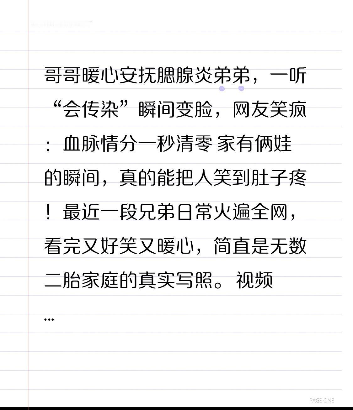 哥哥暖心安抚腮腺炎弟弟,一听“会传染”瞬间变脸,网友笑疯:血脉情分一秒清零 家有俩娃的瞬间,真的能把人笑到肚子疼!最近一段兄弟日常火遍全网,看完又好笑又暖心,简直是无数二胎家庭的真实写照。 视频里,弟弟不幸得了腮腺炎,小脸肿得像个小馒头,难受得直哼哼,委屈巴巴的。哥哥一开始心疼坏了,连忙凑到弟弟身边,又是轻轻摸头,又是小声安慰,眼神里全是宠溺和心疼,还主动要陪着弟弟,生怕弟弟孤单难受。画面温馨又治愈,不少网友都被这兄弟情深打动,直呼哥哥也太暖了。 可就在下一秒,妈妈在旁边随口说了一句:“腮腺炎会传染,哥哥离远点,别被传染了。” 万万没想到,前一秒还温柔体贴的哥哥,听完这句话,脸色瞬间大变!刚才还温柔抚摸的手立马收回,身体“嗖”地一下往后弹,动作快到模糊,刚才的温情脉脉一秒消失,脸上写满了“警惕”和“拒绝”,甚至还默默搬着自己的小凳子,离弟弟远远的,生怕被传染上。 刚才的兄友弟恭,瞬间变成“避之不及”,反差大到让人猝不及防,网友们直接笑喷:这翻脸速度比翻书还快! 有网友调侃:血脉情深是真的,怕被传染也是真的;还有人说,这就是亲哥的真实反应,主打一个现实又可爱。 其实这就是孩子们最纯粹的天性,没有丝毫伪装,心疼弟弟是真心的,害怕生病也是真心的。看似“无情”的变脸,恰恰是兄弟间最真实、最可爱的模样。没有刻意的煽情,没有表演的痕迹,普普通通的家庭日常,却藏着最治愈的烟火气。 生活里,多少二胎家庭都是这样,打打闹闹是常态,互相嫌弃是日常,可真到了关键时刻,哥哥姐姐永远是弟弟妹妹最坚实的依靠。这种吵不散、割不断的血脉亲情,才是最珍贵的幸福。 你家有没有这样一对欢喜冤家兄弟姐妹?欢迎在评论区分享你们的搞笑日常,看看谁家的娃更真实!