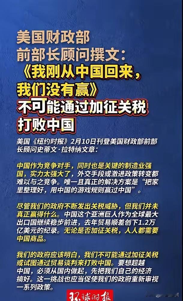 美国财政部前部长顾问撰文:不可能通过加征关税打败中国 美国高官终于说了实话,加征关税根本打不赢中国。这位前财长顾问刚从中国回来,看得明明白白。 中国体量太大,制造业实力太强,不管是外交施压还是关税打压,都压不垮我们。美国折腾这么多年,贸易战没占到便宜,反而让自己的企业和老百姓多花钱。 他还说,美国想赢,只能先把自己国内的事做好,甚至要按照中国的发展思路去竞争。这话很实在,也打了很多美国政客的脸。 有网友说,以前美国总觉得自己定规矩,现在不得不承认,中国的模式更管用。 中国的技术、产业链、市场都在快速变强,不是靠打压就能拦住的。 笔者认为,事实证明,贸易对抗没有赢家,合作才是正道。中国不惹事,也不怕事,谁想靠关税搞霸凌,最后只会搬起石头砸自己的脚。 对此,你怎么看呢?