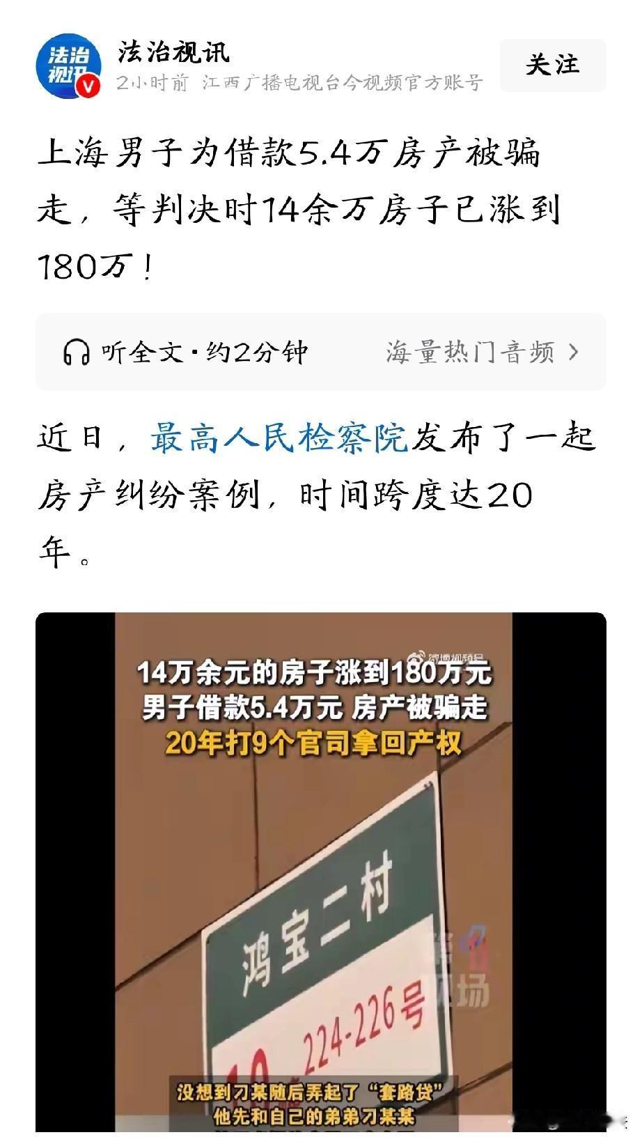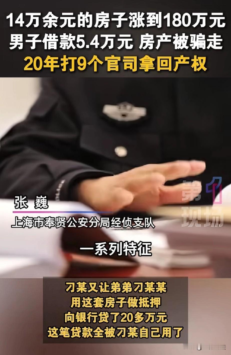 上海,男子20年前急用钱,他向朋友借了5.4万元,并把名下市值14.15万元的房子过户给朋友作担保,想着等借款还清再把房子过户回来,这样朋友心里也踏实。岂料,朋友暗藏祸心,把房子抵押给银行贷款20万元用来挥霍。贷款逾期后,法院来查封房子,男子这才得知事情真相。如今,房子已经涨价至180万,男子历时20年,打了9场官司,房子还是迟迟无法过户。 2003年,男子季某遇到了急事儿,手头实在缺钱。他思来想去,决定向朋友刁某借5.4万元应急。 刁某提出,让季某把名下的一套房子过户给他作担保,还说这样自己心里踏实,等季某把钱还清了,再把房子过户回去。 季某当时也没多想,觉得这朋友平时看着挺靠谱,而且自己只是暂时抵押房子,等还了钱房子就能回来,就同意了。 当时,那套房子市值14.15万元,两人商量后按5万元作价完成了过户手续。 季某满心想着赶紧把钱凑齐还上,好把房子拿回来。可他万万没想到,刁某早就打起了坏主意,玩起了“套路贷”。 刁某先是和自己的弟弟刁某某签了一份虚假的房屋买卖合同,神不知鬼不觉地把季某过户担保的房子转到了弟弟名下。 接着,刁某又让弟弟用这套房子做抵押,从银行贷了20多万元。这笔钱一到手,刁某就拿去挥霍了,完全没打算还。 从2005年开始,刁某就拒不还贷了。银行多次催款无果后,只好向法院起诉。 欠债还钱,这没什么说的。法院审理后,决定查封拍卖这套房产,偿还银行逾期贷款。 季某这才得知了事情的真相,那一刻,他只觉得天旋地转,自己原本只是想借点钱应急,怎么就把房子搭进去了呢?他又气又急,赶紧报了案。 经过调查,刁某的“套路贷”行为构成了诈骗罪,最终被法院判处有期徒刑9年,还被判决退赔季某11.93万元。 20年的维权路,房价早已暴涨,如果真的按原值赔偿,这对季某而言明显是不公平的。 这11万余元的退赔款,是按照房子在2003年时的价值计算的,如今,这套房子的价格已经涨到了180万元。 这套房子是季某一家五口三代人唯一的住房,他不要这11万的赔偿,他想要的是保住自己的房子。 自己辛苦打拼半辈子买的房子,怎么能就这么没了呢?他坚决拒绝退赔,要求刁某返还涉案房屋。 后来的民事诉讼中,虽然法院认定刁某与其弟刁某某签订的房屋买卖合同无效。 《民法典》第一百四十六条规定:行为人与相对人以虚假的意思表示实施的民事法律行为无效。季某过户仅为借款担保,并非真实买卖;刁某兄弟虚构合同、恶意抵押,属通谋虚伪,房屋买卖合同应认定无效。 刁某以非法占有为目的,虚构交易套贷,构成诈骗罪,刑事追责不影响民事确权,房屋权属仍归季某。 从法律角度而言,这套房子根本上确实属于季某,但由于房子已经被抵押给了银行,根本无法过户。 从那以后,季某踏上了漫长而艰难的维权之路。这20年来,他历经了9次诉讼,每一次都满怀希望地去,却总是失望而归。 每次看到法院的判决,他都觉得离拿回房子又近了一步,可现实却一次次地给他泼冷水。 他四处奔波,找律师、跑法院,身体也越来越差,可他始终没有放弃,一心只想拿回属于自己的房子。 四处碰壁后,季某实在没办法了,只好向检察院申请监督。 检察院介入后,开始积极协调各方。他们先找到刁某和刁某某兄弟俩,反复做他们的工作,最终让他们同意支付贷款本金及部分利息。 季某也承担了剩余的利息,同时检察院还和银行协调,制定了一个分期付款方案。 考虑到季某的生活依旧十分艰难,他已经退休,每个月只有微薄的退休金,而且还身患重病,妻子也没有收入。 检察院为他发放了司法救助金,这让季某心里稍微宽慰了一些。 在检察院的不懈努力下,各方终于达成了共识。2025年3月,季某终于拿到了房产证。 这20年的艰难维权,他吃了太多的苦,受了太多的委屈,如今终于有了结果。