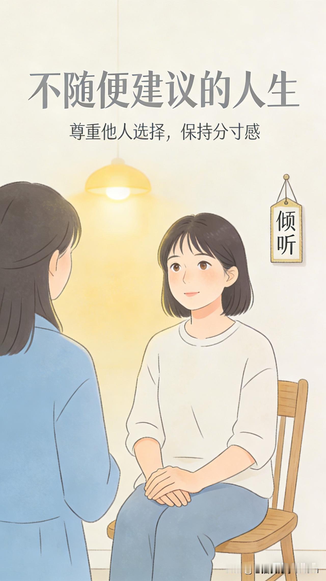 成熟的人,不随便提建议 不是冷淡,是终于醒悟: 你随口一句建议,就是别人要扛的人生。 给对了,是他英明; 给错了,是你全责。 我们总爱以“为你好”指点人生, 不过是贪恋“我比你懂”的优越感。 可你不是上帝, 凭什么替别人选路? 后来我只做一件事: 只给信息,不给结论; 只陪不教,只听不劝。 不干涉,不雕刻,不绑架。 你选你的甜,我守我的边界。 真正的成熟, 是懂得收起好为人师,尊重别人的人生。 有些苦要自己吃, 有些甜要自己尝, 有些路,只能自己走。