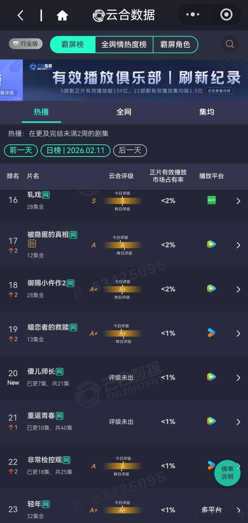 2月11日云合播放占比云合 唐宫奇案14.5%登顶了,评级略有下降成何体统13.6%评级上移,看看明天能不能登顶。太平年13.5%看趋势感觉S+不一定保得住。古装剧这么大的盘子,三部古装剧也没拉起来,长剧市场着实低迷。生命树9.2%年少有为7.2%风过留痕7%乡村爱情18 5.8%这剧真是长尾绝了