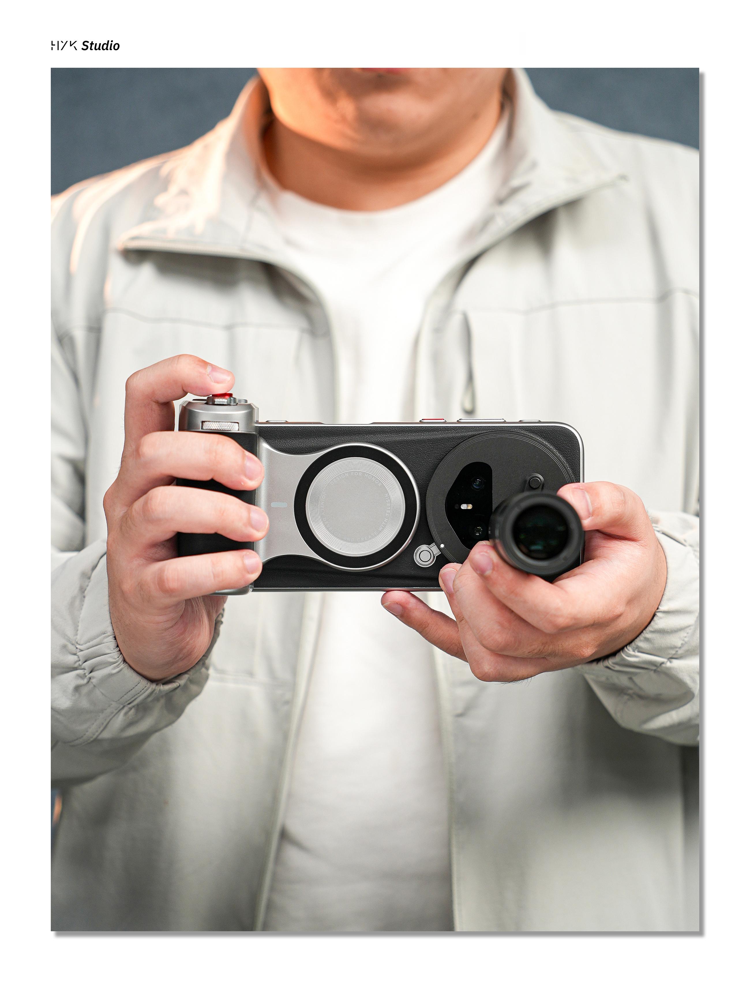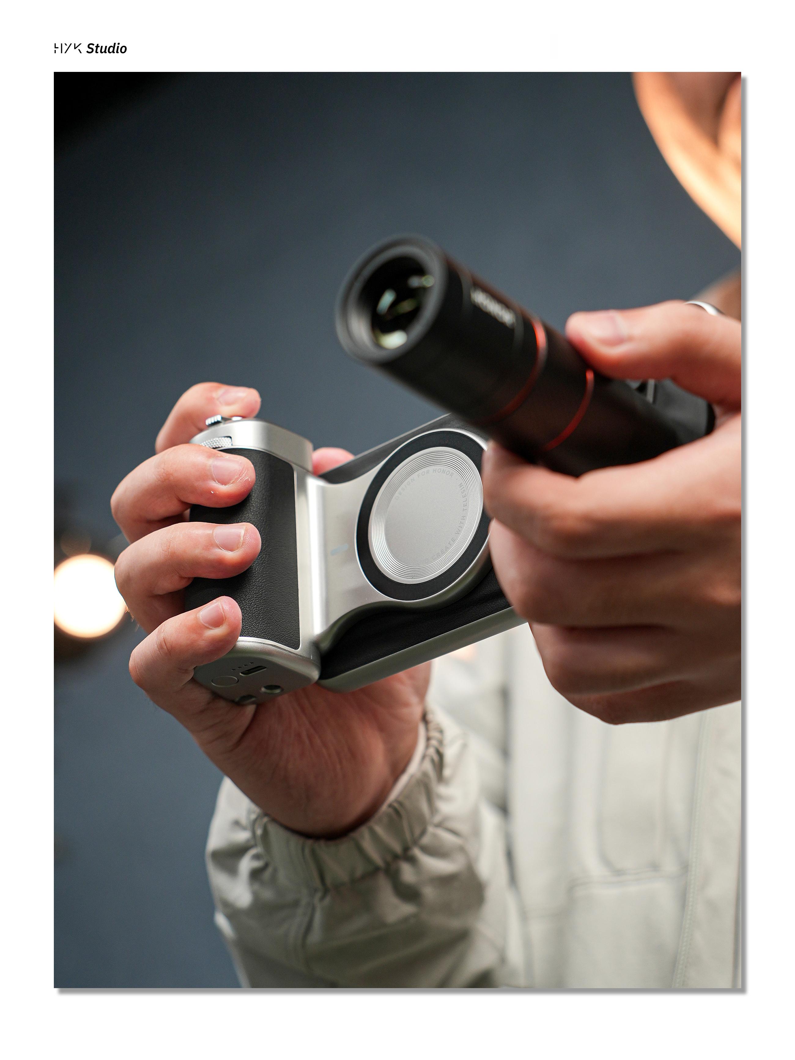 专属保护壳保留了机身标志性的保时捷飞线设计,滤镜转接环是简约的环形造型,摸起来金属质感细腻,很精致。增距镜小巧,造型简洁。磁吸手柄握起来很圆润,搭配点睛的红色按键,颜值和手感都在线。整套设计简约又不失格调,拿出去扫街,逼格拉满。