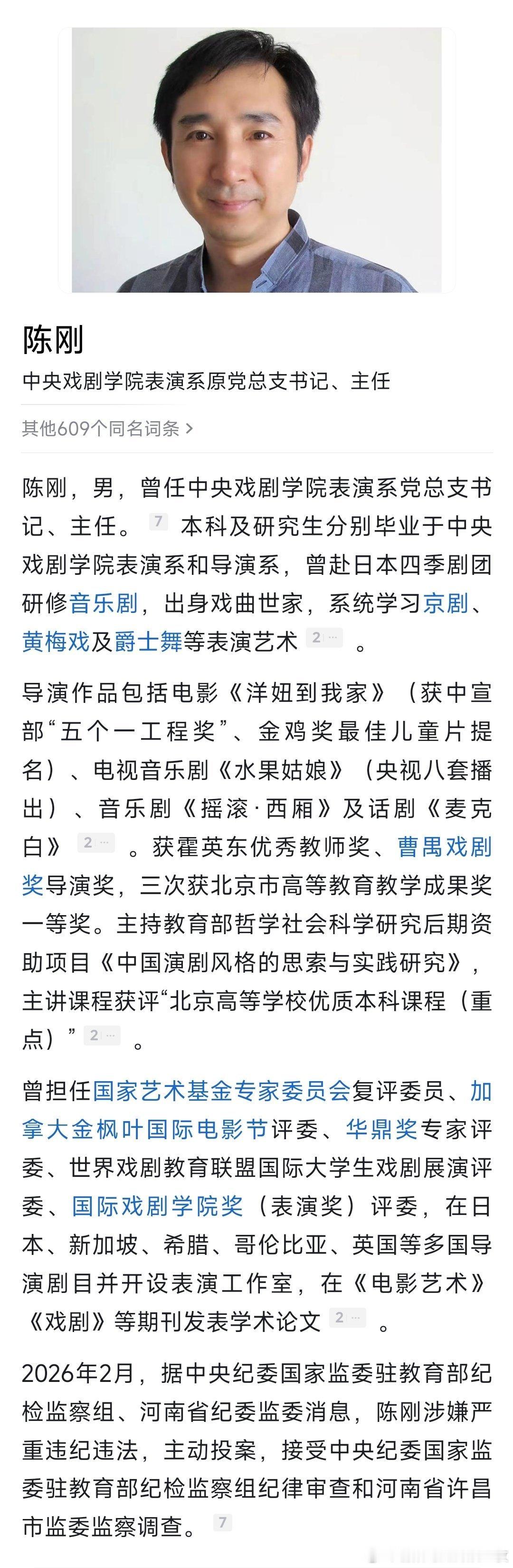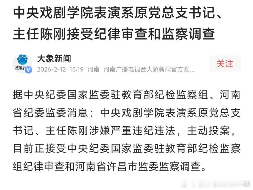 中戏表演系原主任陈刚主动投案中央戏剧学院表演系原主任陈刚接受纪律审查和监察调查。