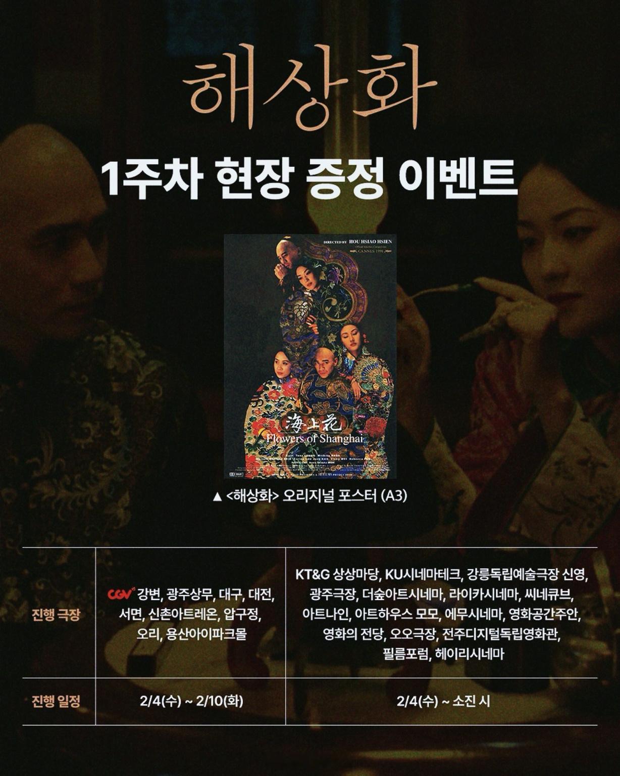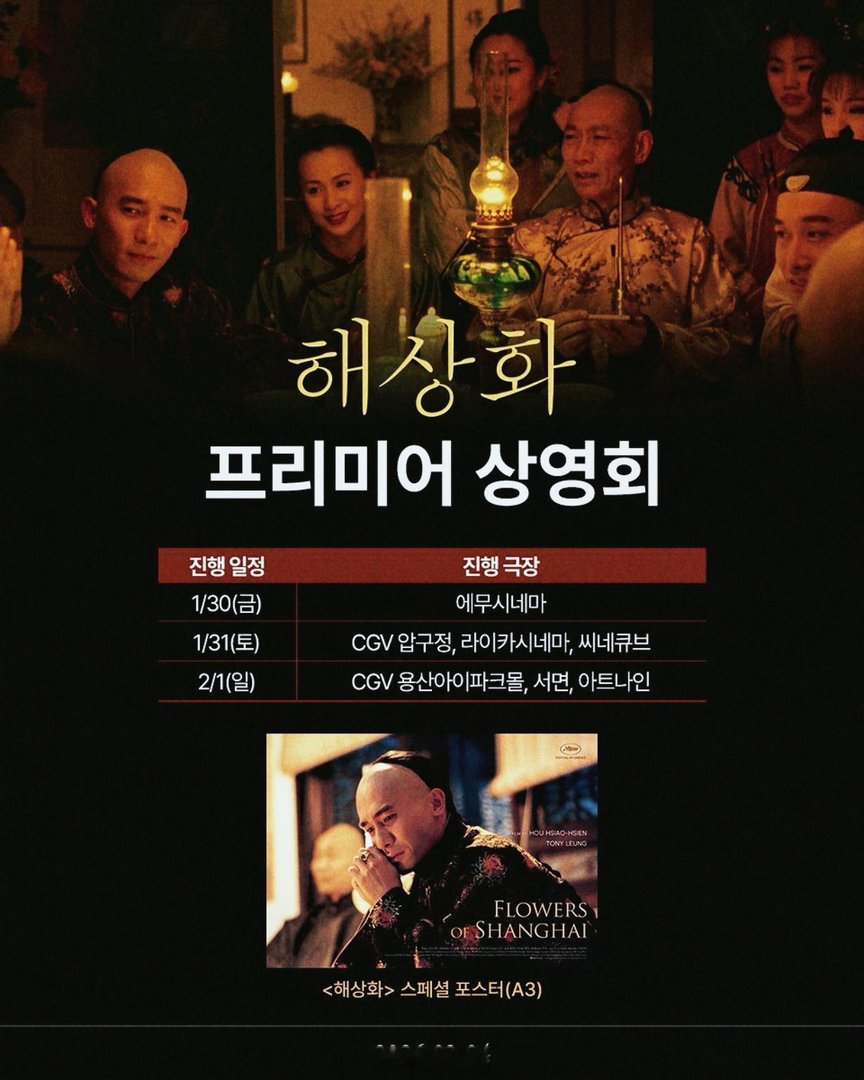 梁朝伟影讯 长三公寓里,红倌人们,和狎妓恩客的故事……侯孝贤导演,梁朝伟梁朝伟 、羽田美智子、李嘉欣、高捷主演【海上花】,高清4K修复版,已于2月4日起,在韩国上映——这次的韩版新海报和新物料,有梁朝伟“王莲生”单人A3,和CGV制式两款实体海报送给影迷。春节档马上有戏