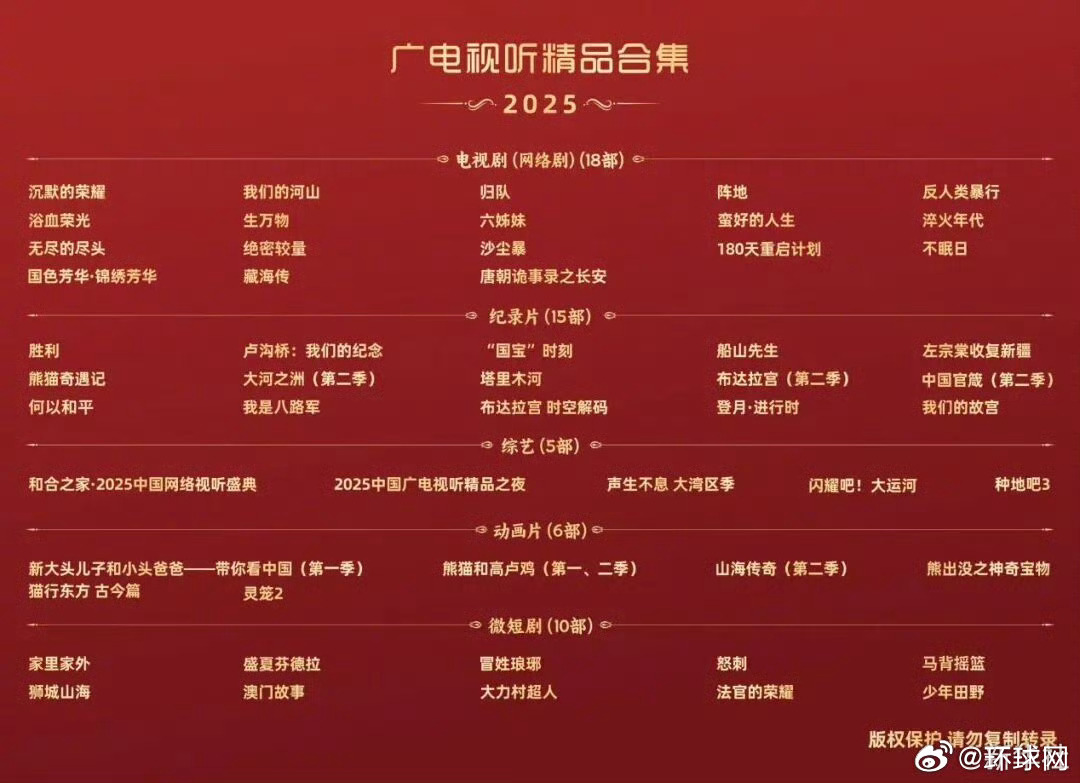 【#藏海传国色芳华等入选2025广电视听精品合集#】近日,国家广播电视总局正式发布“2025广电视听精品合集”,回顾一整年来由光影艺术构成的闪亮印记,横跨电视剧、纪录片、综艺、动画片、微短剧五大赛道的54部年度优秀作品脱颖而出。其中,主演的《沉默的荣耀》,等主演的《我们的河山》,主演的《生万物》,主演的《国色芳华》《锦绣芳华》,等主演的《藏海传》,主演的《唐朝诡事录之长安》等多部电视剧(网络剧)入选,全名单戳↓(广电新视点)