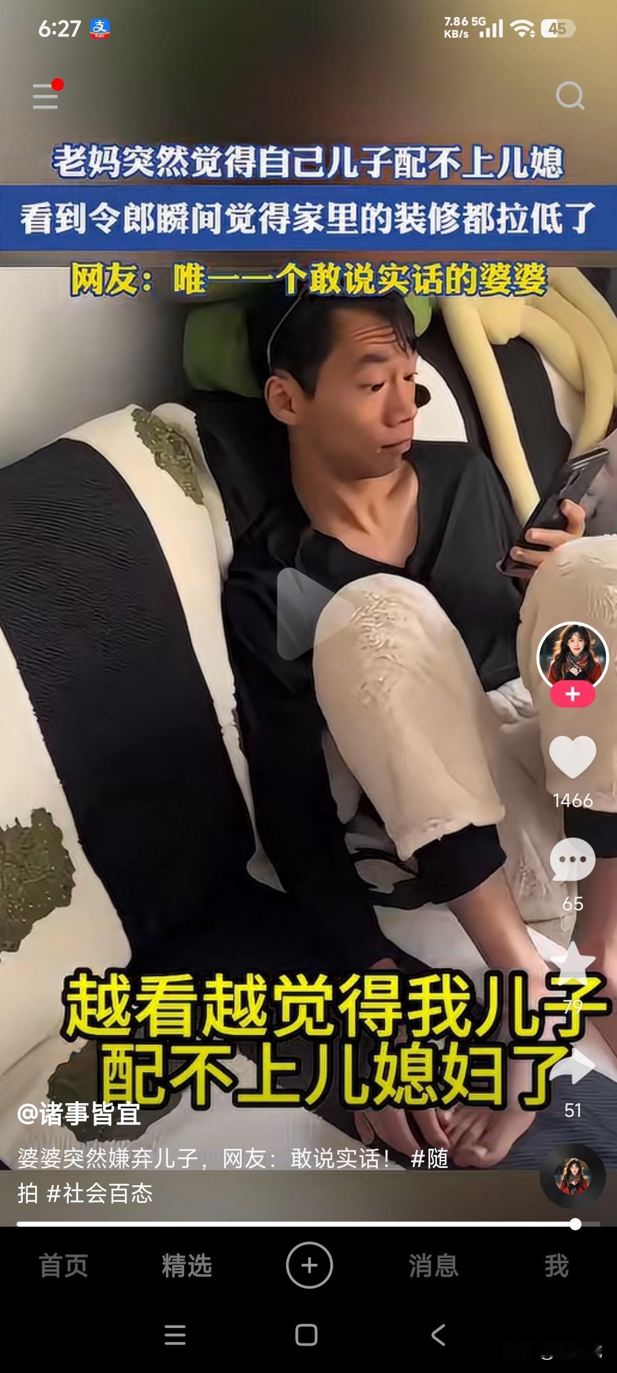 实话实说的婆婆那个女人不羡慕呢? 当妈的越看越觉得自己的儿子配不上儿媳妇,儿媳美若天仙,可是看到令郎后瞬间觉得家里的装修都拉低档次了,这或许是全网唯一一个嫌弃儿子的妈了。 网友们看到这一幕也不淡定了,看到这儿媳妇长的真是漂亮好看,但看到令郎后这哪里是儿子,这不是猴子吗?不知道他俩当初是如何走到一起的,这女子到底看上了这猴子的什么?两人直接一个是天一个是地,压根就不适合在一起,这差别大的不是一丁半点的,为什么这么漂亮的女人就找了一个猴子一样的老公。 就连当妈的都越看越嫌弃儿子,这儿媳妇心里是不是乐呵极了,婆婆终于说了句实话,这样的婆婆那个儿媳妇不喜欢呢?