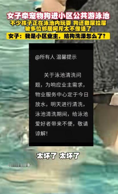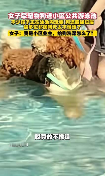 2月8日,安徽,一男子到小区游泳池游泳,却发现一名女业主竟然把自家的宠物狗也带进泳池,虽然牵着绳,却在公共的泳池里面给狗狗洗澡,男子看后大怒:当场斥责她:太坏了! 2 月 8 日的安徽,天气渐渐褪去冬日的寒凉,慢慢变得温润起来,不少小区的公共泳池都恢复了日常开放,成了居民们休闲放松的好去处,尤其是不少家长,都会趁着午后暖和的时段,带着家里的小朋友到泳池浅水区玩水嬉戏。 本该满是孩童笑声的休闲场地,却因为一位业主的出格举动,彻底变了味道,还当场引发了邻里间的激烈争执,让在场的每一个人都觉得既气愤又膈应。 当天下午,事发小区的公共泳池里格外热闹,浅水区里有六七位小朋友套着色彩鲜亮的卡通游泳圈,在水里踩着水花打闹,家长们则守在泳池边缘的休息区。 一边闲聊一边时刻留意着孩子的安全,泳池的水质经过物业每周两次的专业消杀、循环过滤,水质检测数据完全符合居民休闲使用的标准,清澈的水面看着就让人觉得舒心。 可这份平和的氛围,却被一位牵着宠物犬的女业主彻底打破,她手里拎着宠物沐浴露、毛发梳理刷等清洁用品,没有丝毫犹豫,直接牵着狗狗走到了泳池边,完全没在意泳池里还有不少正在玩耍的孩子。 紧接着,这位女业主做出了让所有人瞠目结舌的举动,她牵着狗狗直接踏入泳池浅水区,蹲下身就开始给狗狗涂抹沐浴露揉搓毛发,狗狗身上脱落的浮毛、附着的污垢,混着白色的沐浴泡沫,一点点漂浮在泳池水面上,原本干净透亮的池水,短短几分钟就变得浑浊杂乱。 .这一幕被旁边一位正准备下水的男业主全程看在眼里,当下就压不住心头的火气,快步上前当场厉声斥责,直言对方的行为实在过分,完全无视公共场合的基本规则。 周围的家长们反应过来后,立马慌慌张张地将孩子从泳池里抱上岸,生怕孩子皮肤接触到被污染的池水引发不适,周边的邻居们也纷纷围拢过来,纷纷出声制止女业主的行为,提醒她这是供人使用的公共泳池,并非宠物的洗浴场所。 更让众人难以接受的是,狗狗在泳池里受到争执声的惊扰,直接在水中排便排尿,污物在水里快速扩散,原本整洁的泳池彻底被污染,现场的画面让在场居民都露出了反感的神情,现场的争执氛围也瞬间变得愈发紧张。 面对众人的集体劝阻和指责,这位女业主非但没有停下动作,反而摆出了理直气壮的态度,当场反驳称自己是小区业主,有权使用小区内的公共设施,给自家狗狗洗澡是自己的私事,旁人没有资格多管。 这样的狡辩让在场的业主们更加气愤,有人当即拍下现场画面留存证据,还有人第一时间拨通了小区物业的电话,请求工作人员到场处理。 物业工作人员赶到现场后,当场出示了小区公共泳池的管理细则,细则中明确标注禁止携带任何宠物进入泳池区域,严禁在池内进行宠物清洁、排泄等污染水质的行为。 据物业后续核算的具体数据显示,该小区公共泳池完成一次完整的排空污水、重新注水、深度消毒、过滤系统全面清洗的流程,整体费用接近两千元,整个操作耗时超四小时,还会导致泳池暂停开放,直接影响小区内两百多位业主的正常休闲使用。 在物业的反复劝导和众多业主的坚持下,这位女业主才最终牵着狗狗离开泳池,自始至终都没有向在场的家长和居民表达歉意。 物业第一时间关闭了泳池开放通道,安排专人对泳池进行全面清理消杀,尽可能恢复水质标准。 这件事被现场业主发布到网络平台后,迅速引发了全网网友的关注,评论区的网友几乎一边倒地谴责这种缺乏公德心的行为,不少自家饲养宠物的网友也发声表示,养宠是个人自由,但绝不能以损害公共利益为代价。 有公共卫生相关数据显示,宠物体表携带的细菌、真菌、寄生虫卵等有害物质,进入泳池水体后,常规循环过滤设备很难彻底清除,儿童免疫力较弱,接触污染水体后,皮肤过敏、炎症感染的风险会提升三倍以上,这也是全国超九成的小区泳池、公共场所都明令禁止宠物入内的重要原因。 其实这类无视公共规则的不文明养宠行为,在各地都曾出现过类似案例,有城市小区出现宠物进入儿童游乐区。 公园草坪宠物粪便长期无人清理、遛狗不牵绳吓到老人孩童等情况,这些事件的本质,都是部分人忽视公共秩序,将个人喜好凌驾于他人权益之上。 小区的公共设施,是全体业主共同出资维护、共同享用的资源,每一处公共空间的使用,都需要遵守约定俗成的规则和明文规定。养宠本身没有对错,但文明养宠、尊重他人感受,是最基本的处事底线。 对于这件事,您有什么想说的吗?欢迎评论区留言讨论。 信源:哈尔滨新闻眼2026-02-10——《女子牵宠物狗进小区公共游泳池,不少孩子正在泳池内玩耍狗还撒尿拉屎 被多位邻居呵斥……》