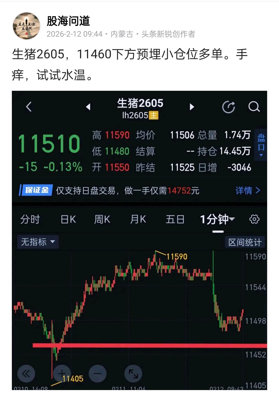 生猪2605,今天的预埋单没有成交,这里只是想小仓位试试水温,操作上也没太大空间,后续再找机会。