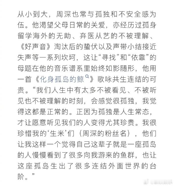周深回应五登春晚周深说自己最大的变化是有安全感了 接受采访时回忆第一次登上春晚的心情,表示从那以后春节对自己的意义又不一样了,给全国人民拜年是件很幸福的事;觉得这十年间自己最大的变化是有安全感了,话也变多了,很感谢和珍惜粉丝。(VOGUE MAN)