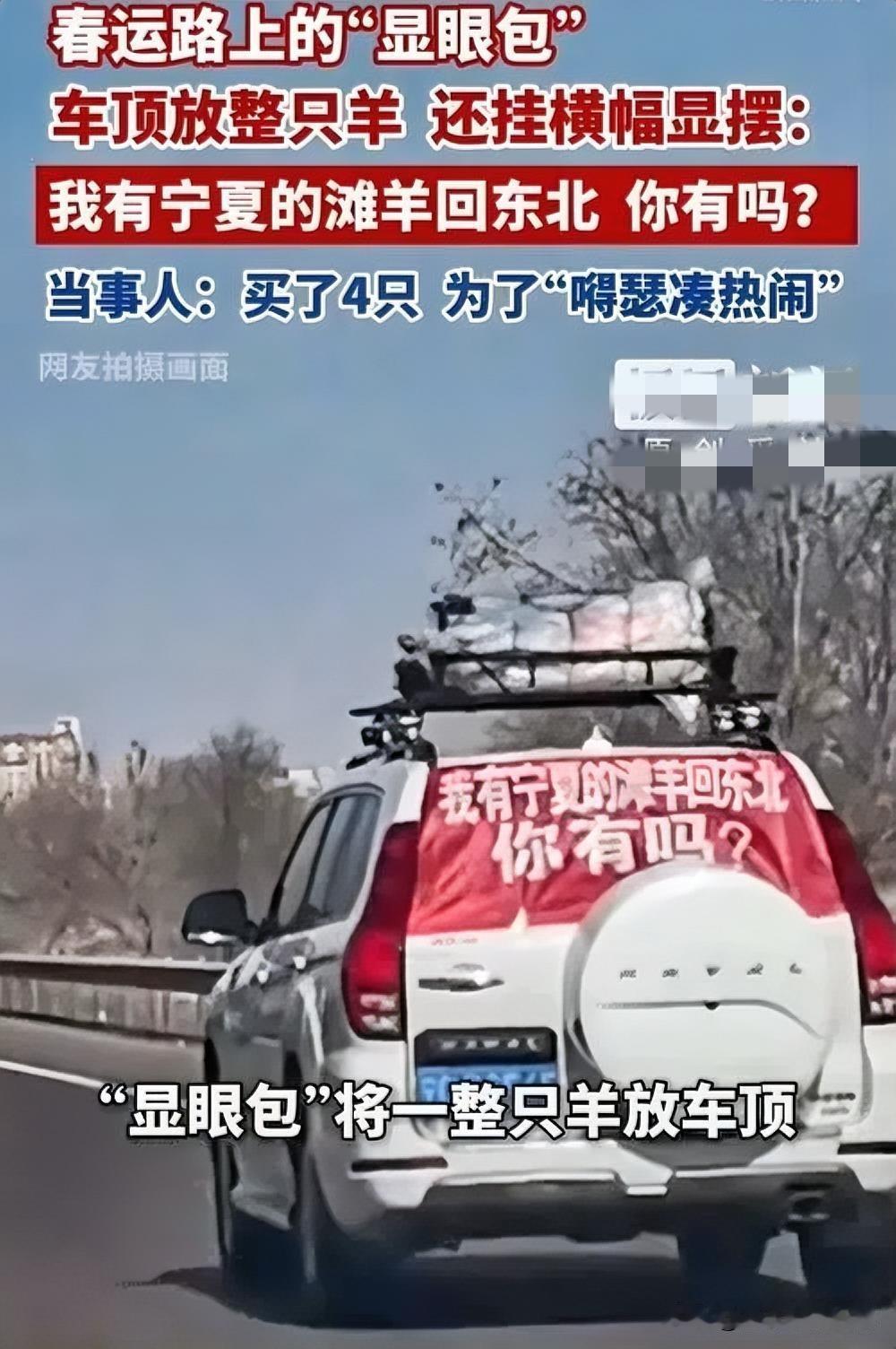 🚗太疯狂!宁夏一女子竟把活羊绑在车顶,一路“狂飙”回黑龙江老家。羊在车顶被风吹得瑟瑟发抖,女子却觉得这样既方便又“拉风”。可这操作隐患重重,不仅违反交通法规,羊也随时可能掉落引发危险。长途运输本就不易,如此任性为之,是对自己和他人安全的不负责,可千万别让“创意”冲昏了头!