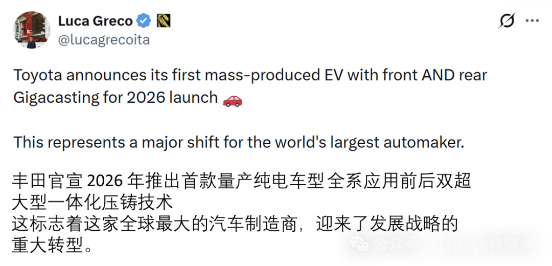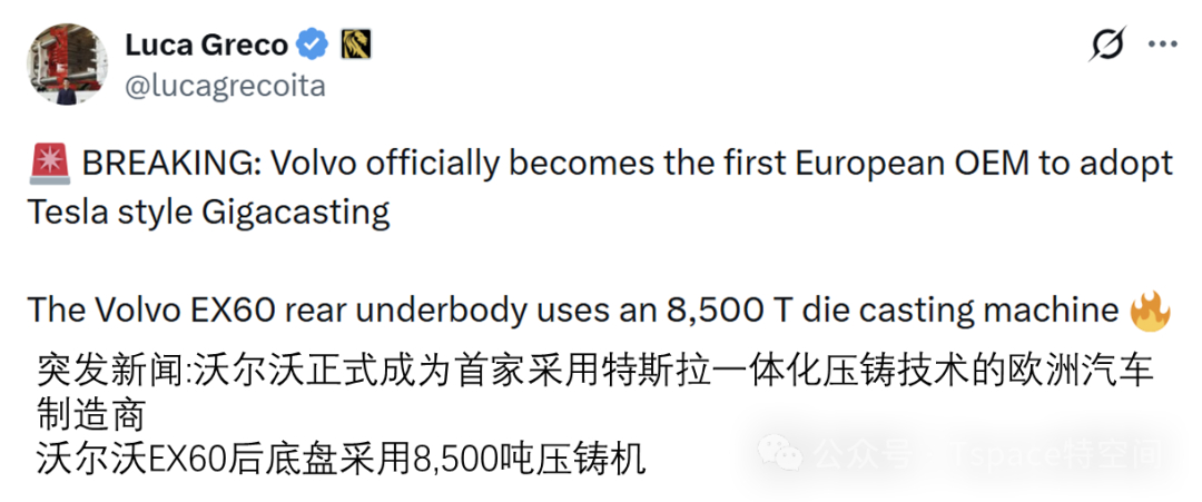 博主马路咖啡in 分析称,特斯拉一体化压铸的价值远不止于生产端的降本提效,更重要的是,它能减轻车身重量、提高续航能力、增强整车的扭转刚度和安全性,堪称纯电车制造领域的一次重要革新。