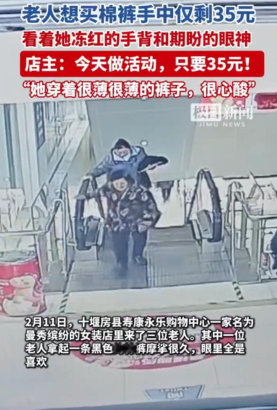 看哭了!湖北十堰,一位老人走进一家女装店,看着一件棉裤很是喜欢,却又不好意思穿,店主走过来说“喜欢就试试”,老人却不好意思说只有35块钱,而店主的回应却让人暖心,她说:35元正好,今天店里做活动! 当天,店里进来三位老人。其中一个七十来岁,头发白了,手冻得通红。她不看那些花哨的款式,径直走到货架一头,拿起一条黑色加绒棉裤,摸了又摸。翻来覆去看了好一会儿,也不问价,也不试穿 郑女士看见了,走过去说,阿姨,喜欢就试试。老人有点不好意思,手还在那裤子上轻轻摩挲。顿了半晌,小声问了一句:我只有35块钱,够不够? 郑女士心里咯噔一下。那裤子进货价都不止35,标价是199 但看着老人的眼神——那是一种既想要、又怕添麻烦的局促。她几乎没多想,嘴比脑子快,话已经出去了:够的够的,今天店里做活动,正好35 老人一下子高兴了,像捡了大便宜,赶紧掏钱,拎着袋子走了 后来郑女士听同行的老人说,这位奶奶是独居低保户,每月生活费就一百块。那天她身上穿的那条裤子,薄得不像过冬的 事后,郑女士把这个事发到了网上,她说自己年轻,亏一点就亏一点,能多给一个人暖和,自己心里也踏实 有网友说:别再说人情淡薄,世态炎凉了!世上还是好人多。这女店主就是一个菩萨心肠,一句话让一个老人不尴尬,又得到了温暖 还有网友说:看见这,我都泪目了,爱老敬老,要落实在行动上为这家店老板点赞!!为她的行为点赞!! 对此,大家怎么看呢?