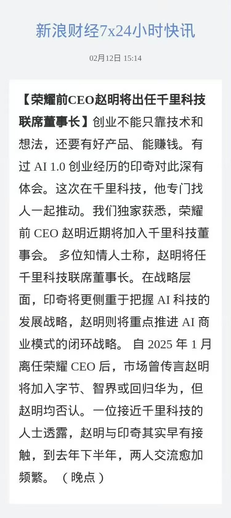 荣耀前CEO赵明将出任千里科技联席董事长 明哥之前说要进入AI行业,千里科技有智能驾驶方面的相关业务,希望明哥在新岗位能给大家继续带来惊喜