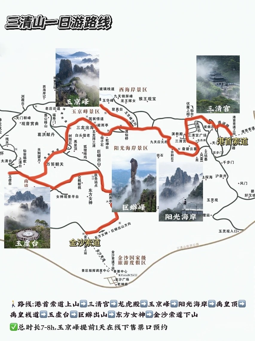 · “揽胜遍五岳,绝景在三清” 刚爬了40年首开的三清最高峰“玉京峰” 不愧是苏轼都赞不绝口的宝藏仙山! 推荐一条轻松不走回头路的路线 ✔️古刹祈福✔️云海栈道✔️奇峰怪石 新春登高祈福第一站就来这里! · 📍|江西上饶三清山风景名胜区 🚄|坐到德兴站,有直达港首索道站的班车,20r/人,车程40分钟。 · 🚶【我的路线】(7-8h) 港首索道上山➠三清宫➠龙虎殿➠玉京峰➠阳光海岸➠禹皇顶➠禹皇栈道➠玉虚台➠巨蟒出山➠东方女神➠金沙索道下山 · ✅【主要景点介绍】 1️⃣三清宫 海拔1533米的千年道教古观,八卦布局,尽显道家气韵,三清山登高祈福就来这里求个上上签。 2️⃣玉京峰 “天上白玉京,十二楼五城”,1819米的三清山最高峰不愧是人间仙境,尘封40年首开,记得提前一天在线下预约。 3️⃣阳光海岸 绝美云海栈道,偶遇好多小松鼠🐿️。随便一处拐角都很出片,找角度与奇峰怪石合影。 4️⃣玉虚台 因玉虚峰而得名,八卦图案的观景台,航拍会更加震撼!云海仙雾缭绕美到失语~ 5️⃣巨蟒峰+女神峰 近距离感受大自然的鬼斧神工,都是破了吉尼斯纪录的必打卡石峰,三清山的名片📷 · 📷【其他游玩tips】 ✔️玉京峰目前只能提前1天在线下售票口预约,每天150个名额,限流的爬山体验感很好。 ✔️港首索道上,金沙索道下,可以看完大部分景点,且基本都是下行路段,会轻松很多! ✔️ 索道17:30停运,逢节假日金沙索道大概率会排队,提前做好时间规划。想深度打卡也可以在山上住一晚。 ✔️ 索道站之间有免费接驳车,行李寄存山下都很方便。 ✔️ 带一些补充能量的小零食的饮用水 ·