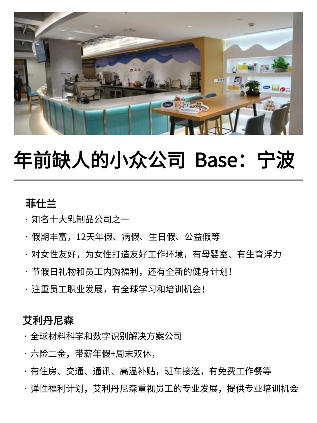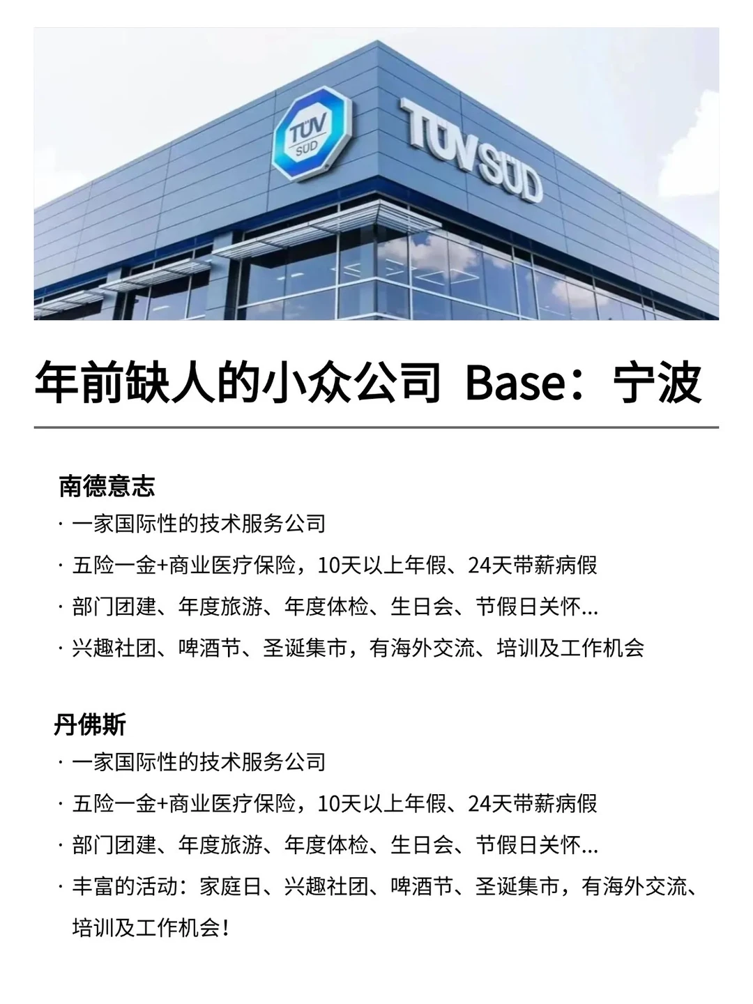 宁波发展真的越来越好,有不少小而美、冷门宝藏的公司,机会是真的很多的! 特别是有不少小众冷门的外企,真心建议大家可以去试试 · 大家不要觉得外企很难进 其实外企也有一些常规类、英语要求没有那么高的岗位 · 为什么还是值得去外企? ✔️氛围好,对女性友好,年假长,基本上都是10天起步 ✔️很多还都支持居家办公、福利完善,是真的能实现WLB ✔️待遇也还不错,年后找工作的真的可以考虑考虑~ · 坚持日更✊🏻,帮大家在找工作路上顺利拿 offer! ·