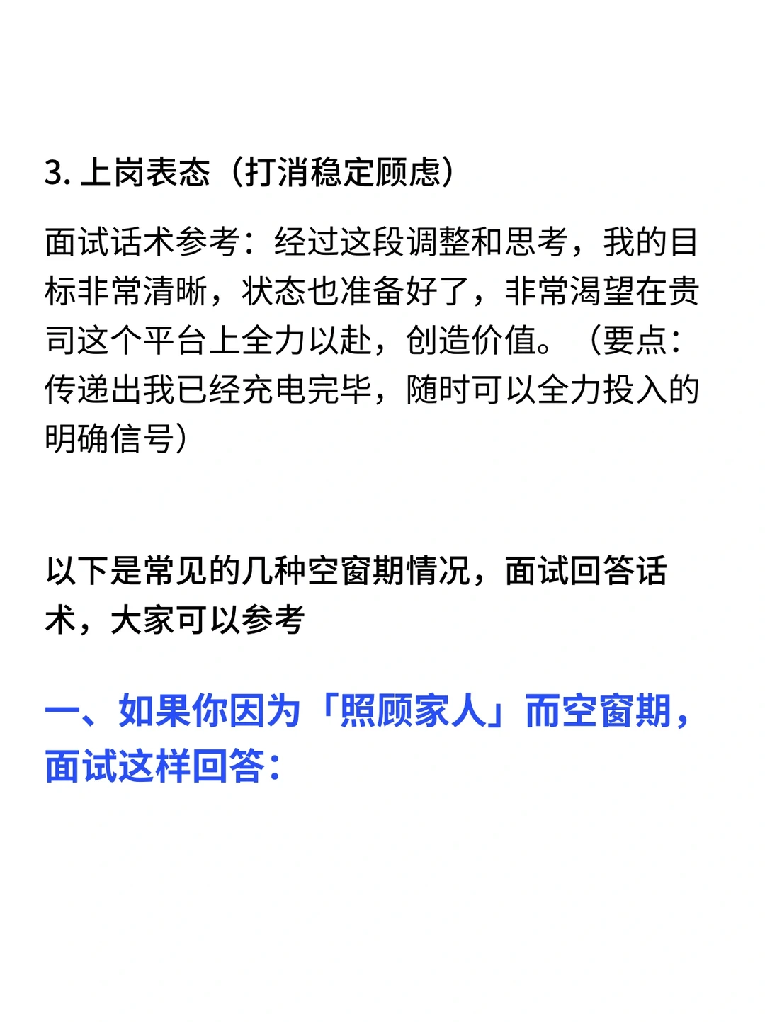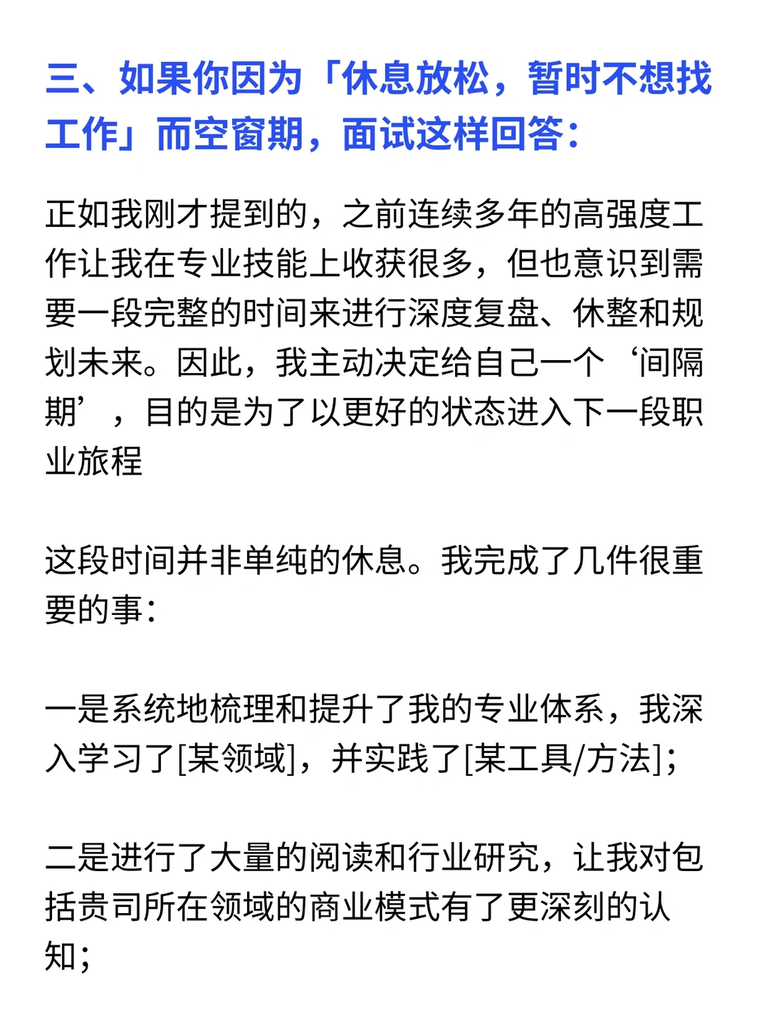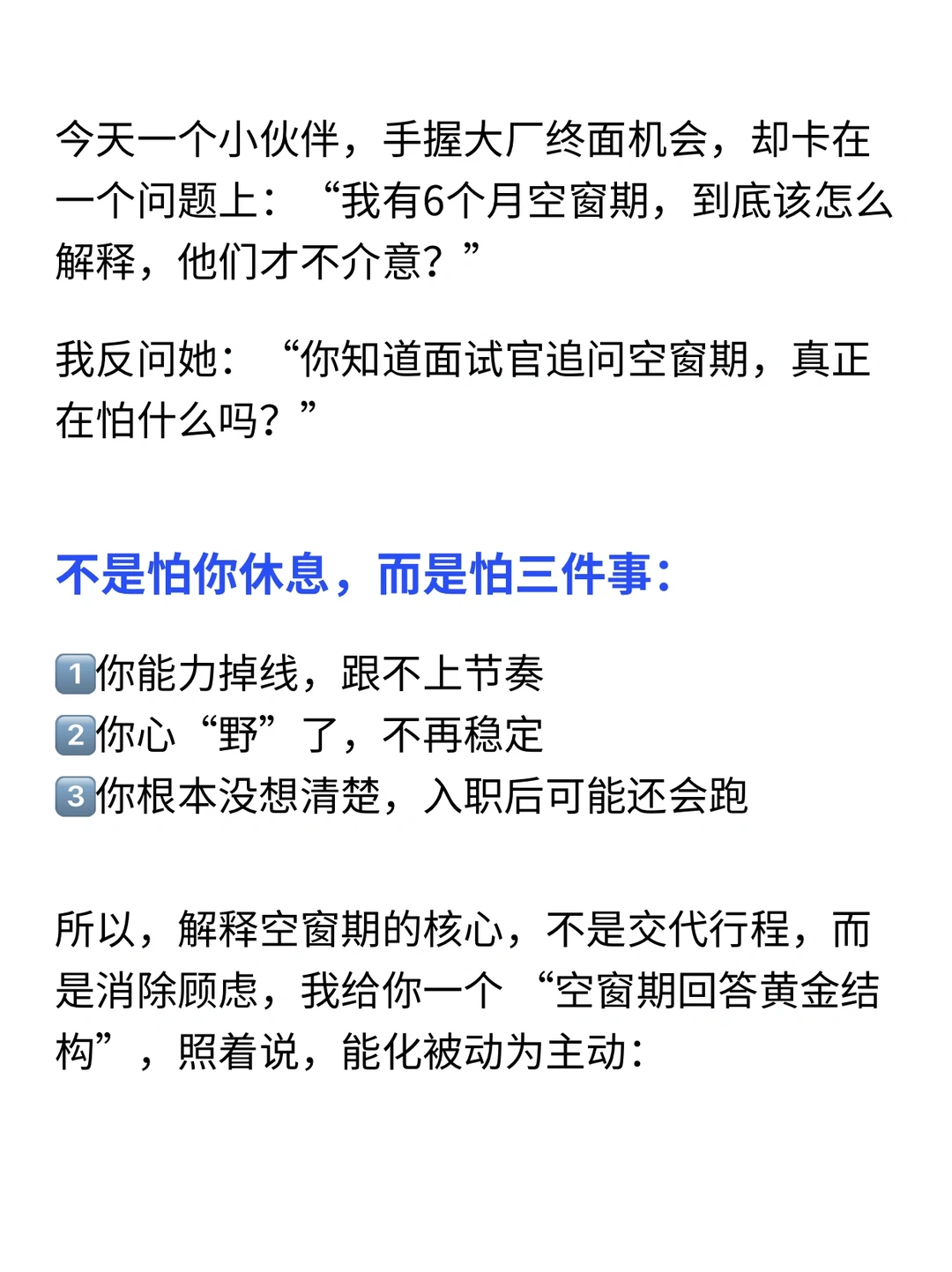 今天一个小伙伴,手握大厂终面机会,却卡在一个问题上:“我有6个月空窗期,到底该怎么解释,他们才不介意?” · 我反问她:“你知道面试官追问空窗期,真正在怕什么吗?” · 不是怕你休息,而是怕三件事: 1️⃣你能力掉线,跟不上节奏 2️⃣你心“野”了,不再稳定 3️⃣你根本没想清楚,入职后可能还会跑 · 所以,解释空窗期的核心,不是“交代行程”,而是“消除顾虑”,我给你一个 “空窗期回答黄金结构”,照着说,能化被动为主动: 结构很简单:解释原因 + 沉淀证明 + 真诚表态 1. 诚挚原因(1句话,真诚不遮掩) ✅面试话术参考👀见图 要点:强调是主动规划,而非被动失业,展现掌控感 · 2. 沉淀证明(这是重点,展示成长) 紧接着,你必须用事实证明你没废掉,反而在充电,分两个层面说 ✅面试话术参考👀见图 要点:将空窗期转化为成长期,所有学习都指向目标岗位 · 3. 上岗表态(打消稳定顾虑) ✅面试话术参考👀见图 要点:传递出我已经充电完毕,随时可以全力投入的明确信号 · 一、如果你因为「照顾家人」而空窗期,面试这样回答(详细内容👀见图) · 二、如果你因为「前司混乱,没有上升空间」而空窗期,面试这样回答(详细内容👀见图) · 三、如果你因为「休息放松,暂时不想找工作」而空窗期,面试这样回答(详细内容👀见图) · 四、如果你因为「被财员了」而空窗期,面试这样回答(详细内容👀见图) · 🙋‍♂️(求职版) 💙我是瑞池,500强外企业务面试官 -