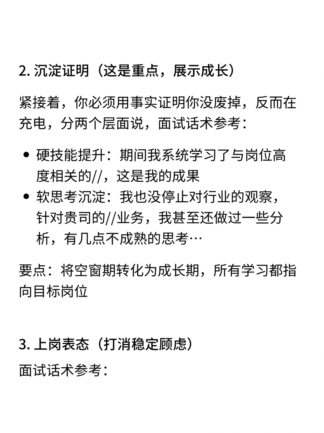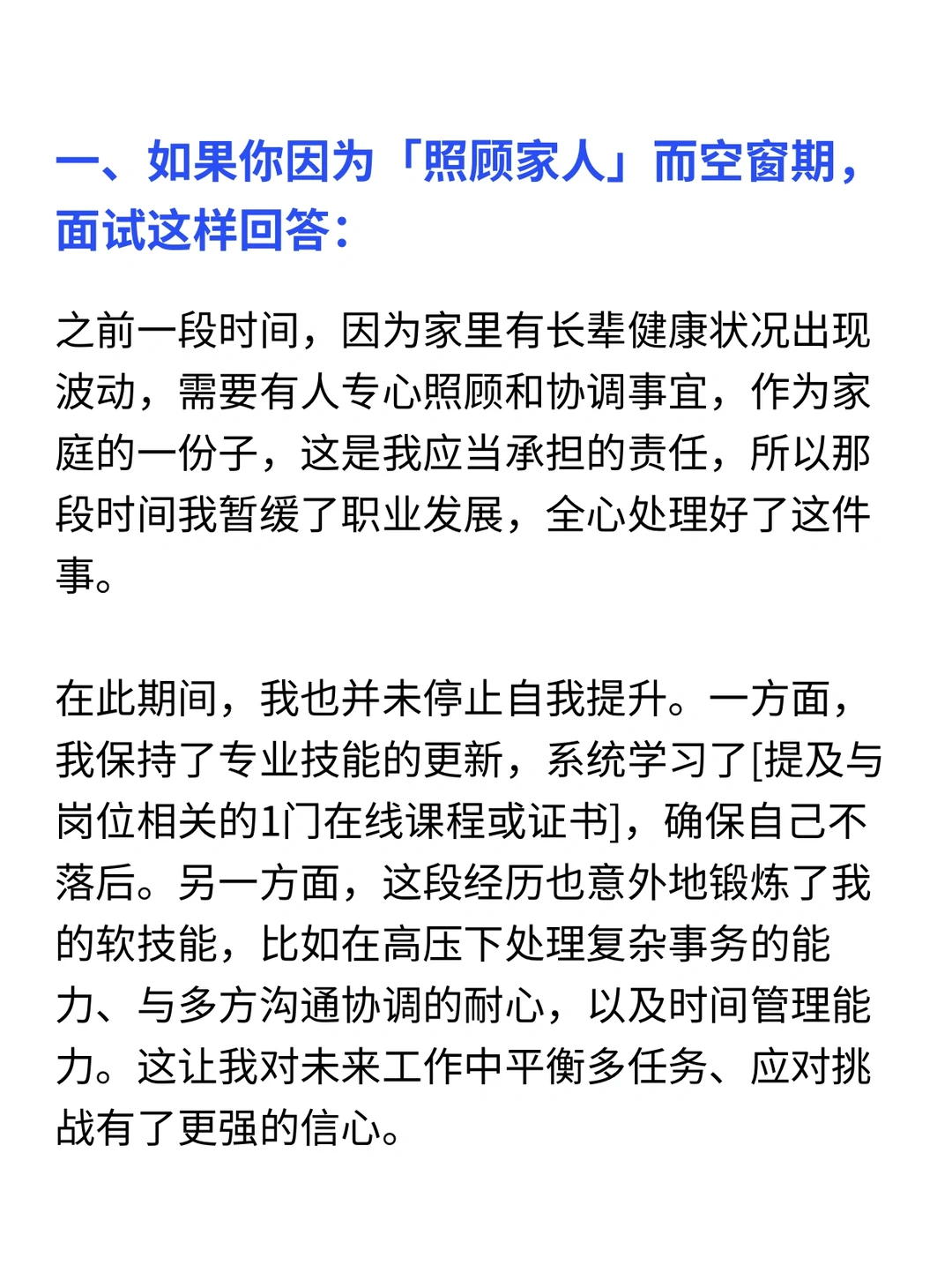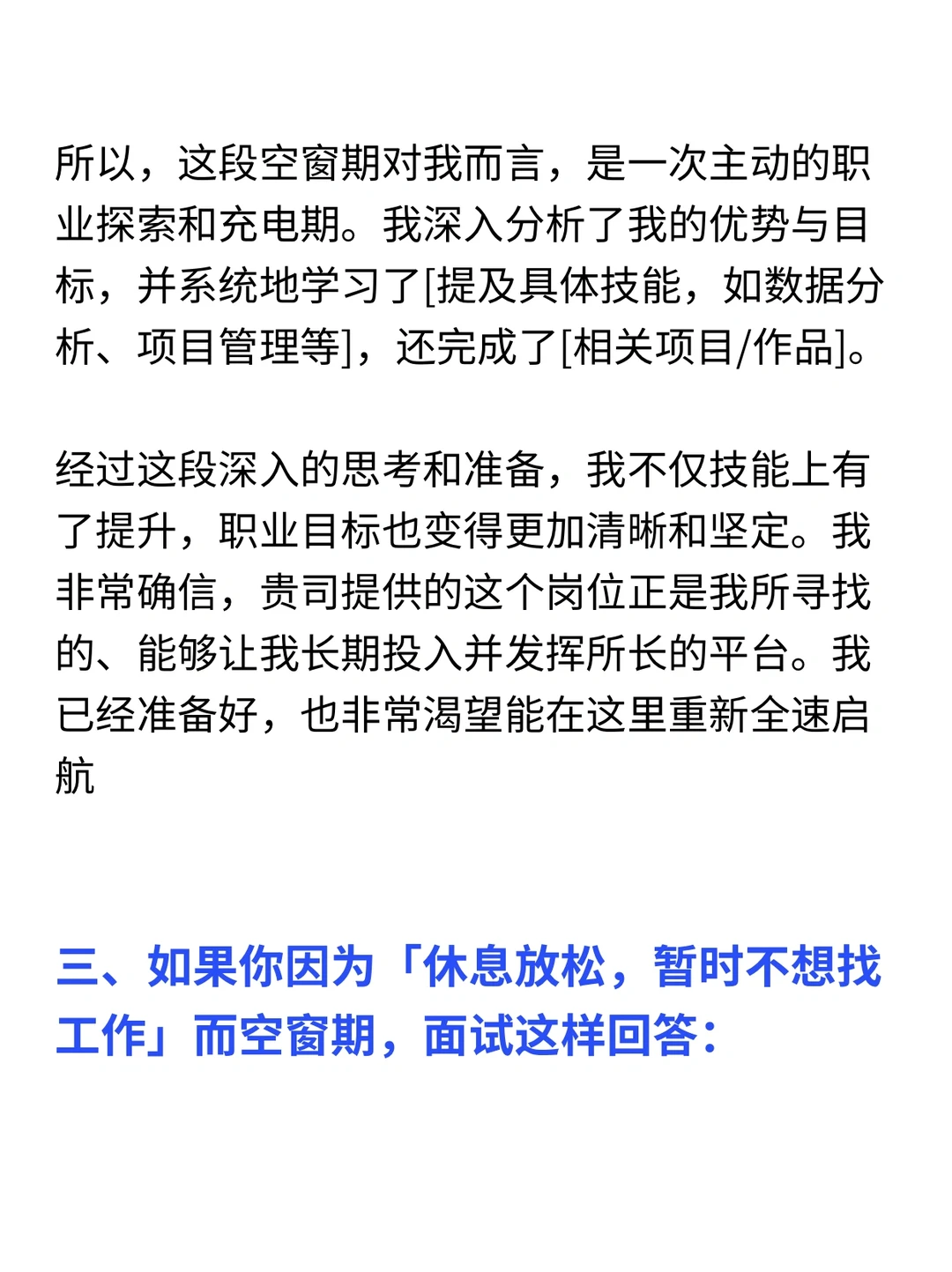 今天一个小伙伴,手握大厂终面机会,却卡在一个问题上:“我有6个月空窗期,到底该怎么解释,他们才不介意?” · 我反问她:“你知道面试官追问空窗期,真正在怕什么吗?” · 不是怕你休息,而是怕三件事: 1️⃣你能力掉线,跟不上节奏 2️⃣你心“野”了,不再稳定 3️⃣你根本没想清楚,入职后可能还会跑 · 所以,解释空窗期的核心,不是“交代行程”,而是“消除顾虑”,我给你一个 “空窗期回答黄金结构”,照着说,能化被动为主动: 结构很简单:解释原因 + 沉淀证明 + 真诚表态 1. 诚挚原因(1句话,真诚不遮掩) ✅面试话术参考👀见图 要点:强调是主动规划,而非被动失业,展现掌控感 · 2. 沉淀证明(这是重点,展示成长) 紧接着,你必须用事实证明你没废掉,反而在充电,分两个层面说 ✅面试话术参考👀见图 要点:将空窗期转化为成长期,所有学习都指向目标岗位 · 3. 上岗表态(打消稳定顾虑) ✅面试话术参考👀见图 要点:传递出我已经充电完毕,随时可以全力投入的明确信号 · 一、如果你因为「照顾家人」而空窗期,面试这样回答(详细内容👀见图) · 二、如果你因为「前司混乱,没有上升空间」而空窗期,面试这样回答(详细内容👀见图) · 三、如果你因为「休息放松,暂时不想找工作」而空窗期,面试这样回答(详细内容👀见图) · 四、如果你因为「被财员了」而空窗期,面试这样回答(详细内容👀见图) · 🙋‍♂️(求职版) 💙我是瑞池,500强外企业务面试官 -