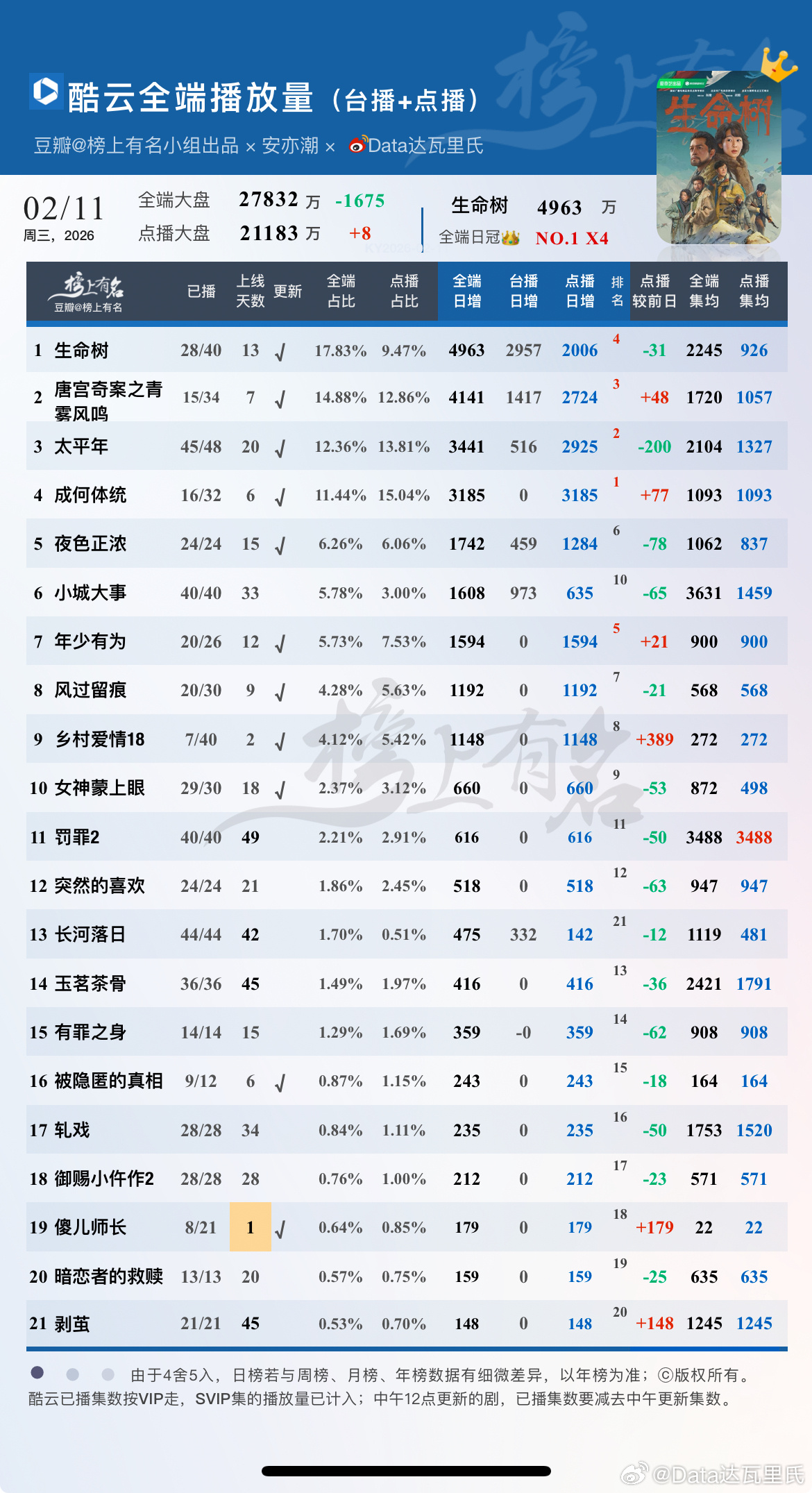 2.11酷云播放量1 生命树 全端日冠👑 NO.1 X4 点播 -31 2 唐宫奇案之青雾风鸣 +48 3 太平年 单集 -200 4 成何体统 +77 横盘微涨,点播端第一5 夜色正浓 -78 6 小城大事 -65 7 年少有为 +21 集均9008 风过留痕 -21 9 乡村爱情18 次日+389 10 女神蒙上眼 -53 11 罚罪2 集均3488
