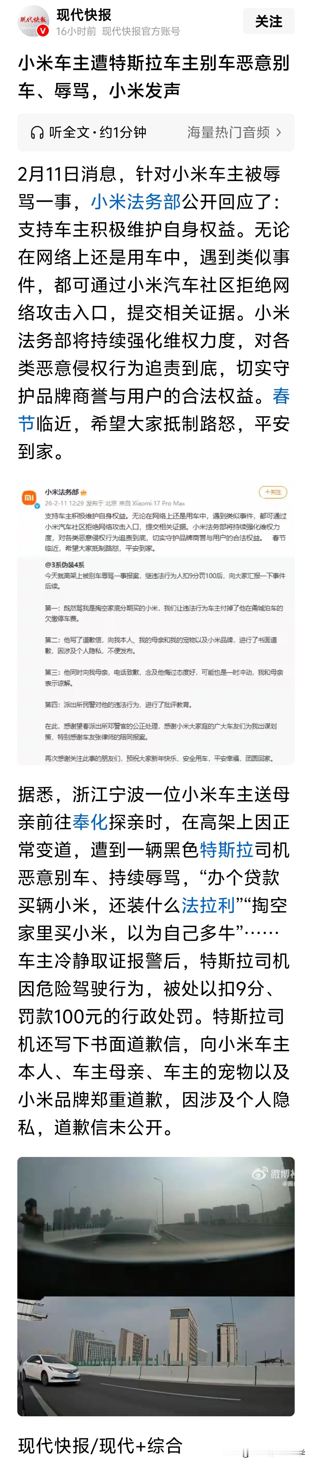 车主取证报警,特斯拉司机因危险驾驶行为,被罚款100元、扣9分,并向小米车主、家人、小米品牌道歉。