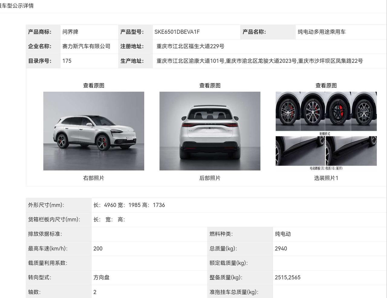好消息!问界M6的工信部证件照来了! 长:4960,宽:1985,高:1736,