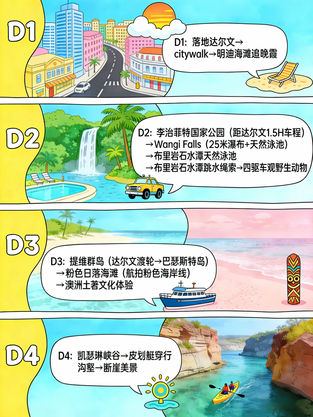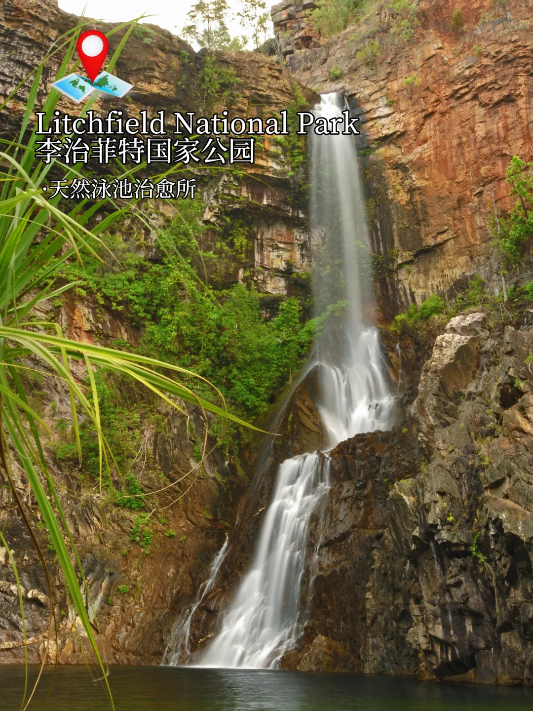 D2:李治菲特国家公园(Litchfield National Park),距达尔文1.5H车程!非常适合作为自然探险的一日游。云芝瀑布(Wangi Falls) 25米的超高瀑布💦而且还是天然泳池~ 布里岩石水潭(Buley Rockhole ),有跳水的绳索贼好玩!!有车道可以开四驱车🚘直接去观察各种各样的野生动物🦒