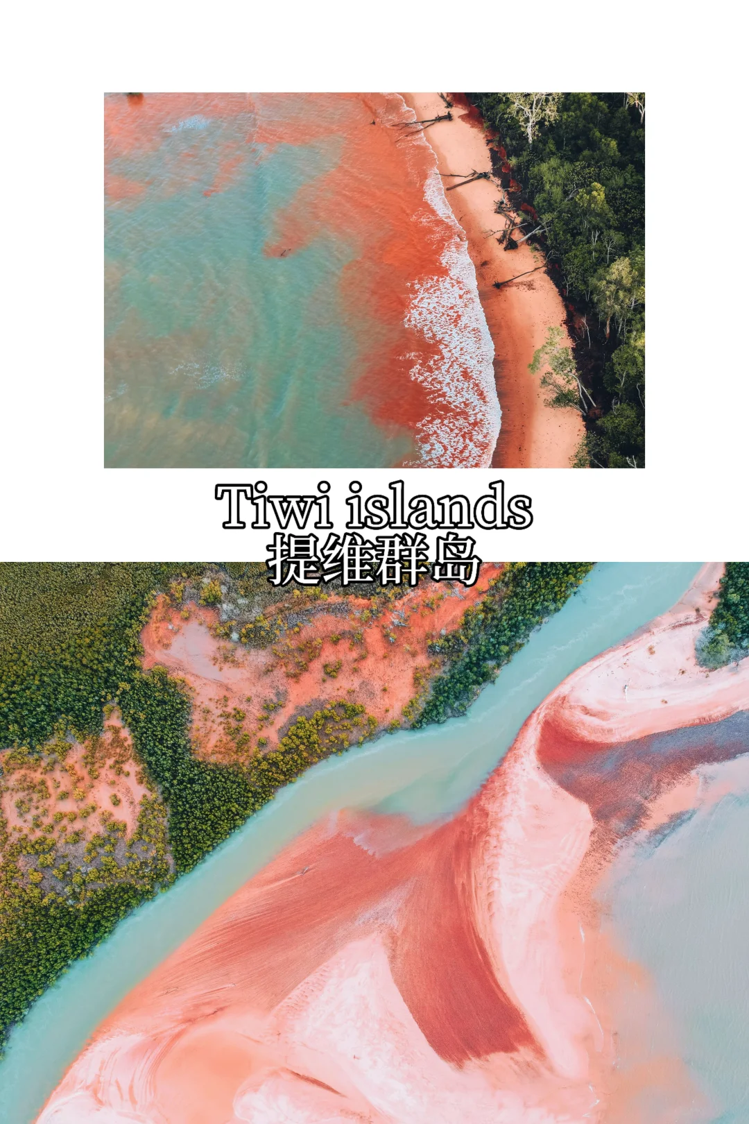 D3:提维群岛(Tiwi Islands):可以从达尔文坐渡轮岛巴瑟斯特岛就可以抵达,个人建议是报一日游的团会比较方便!超神奇的粉色日落的海滩🏝️航拍的时候可以看到非常清晰的粉色海岸线。这个小岛上竟然还生活着一群澳洲土著,他们本身就有深厚的原住民文化,岛上的海边日落绝美。