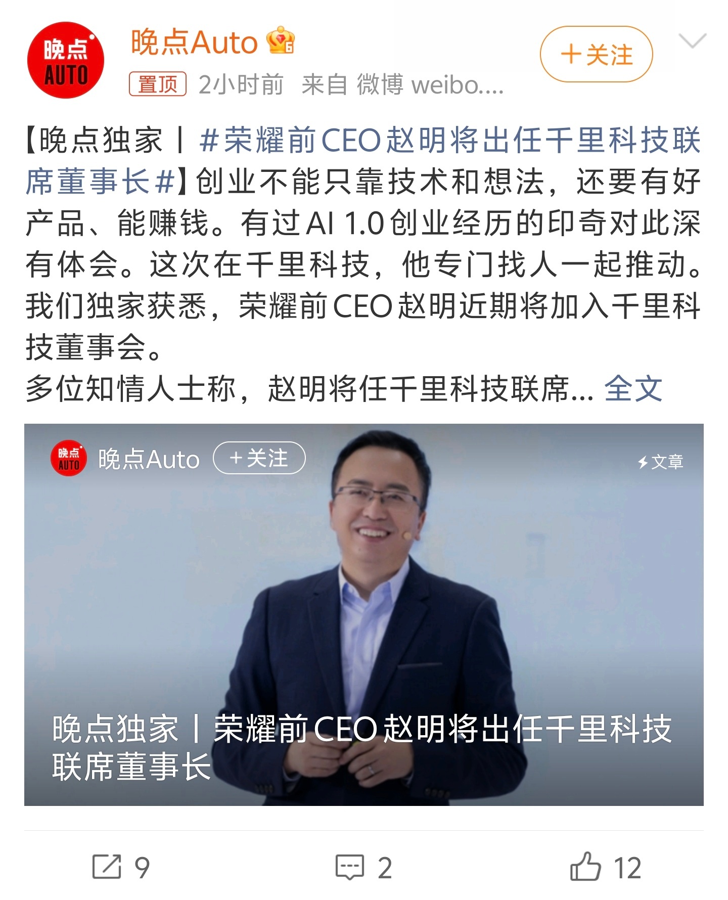 荣耀前CEO赵明将出任千里科技联席董事长这波相当于赵明直接加入吉利了千里科技是吉利深度绑定的AI核心伙伴赵明的加入就是把AI的构想彻底落地