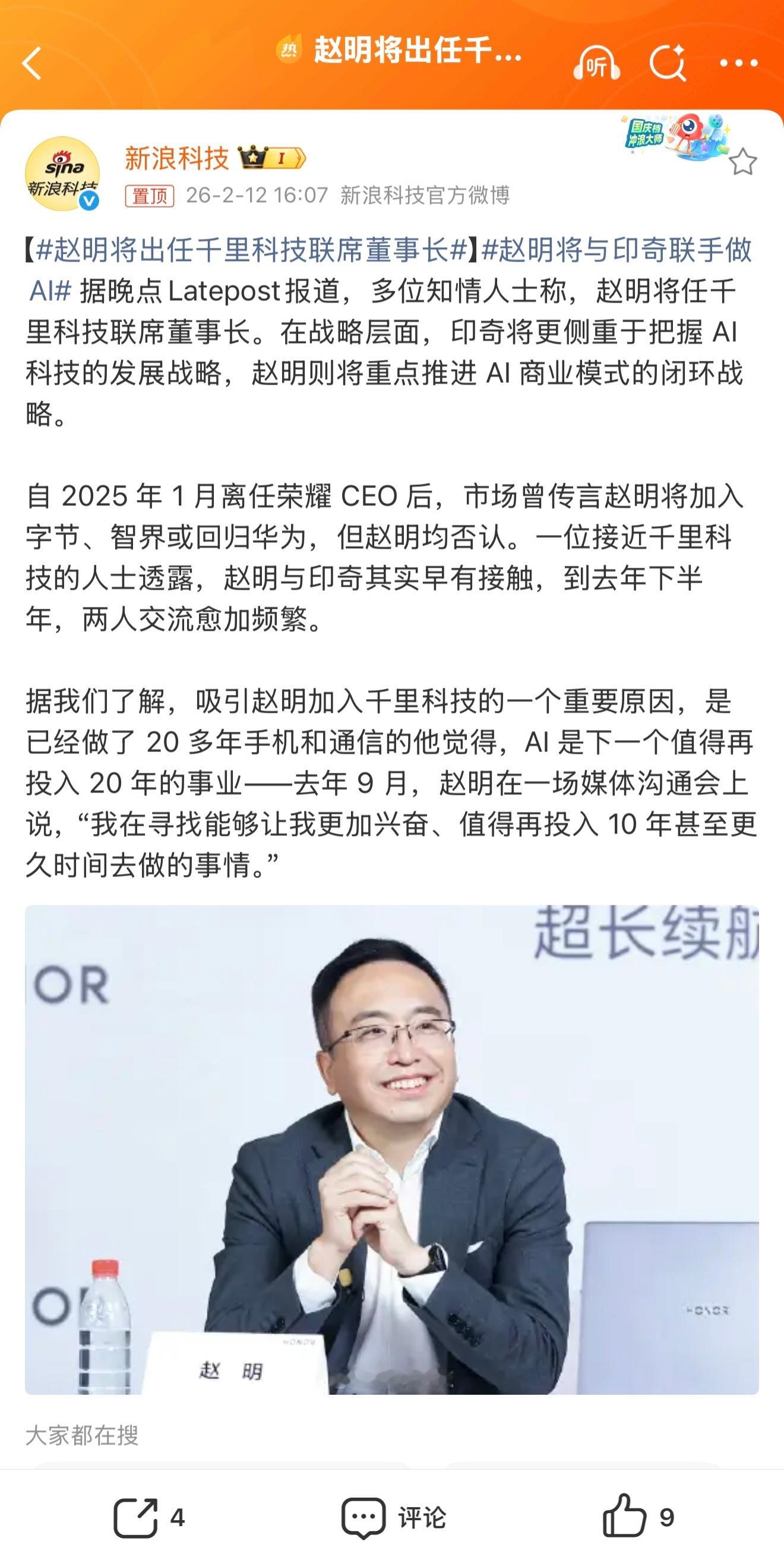 赵明将出任千里科技联席董事长明哥有消息了!下一站搞AI