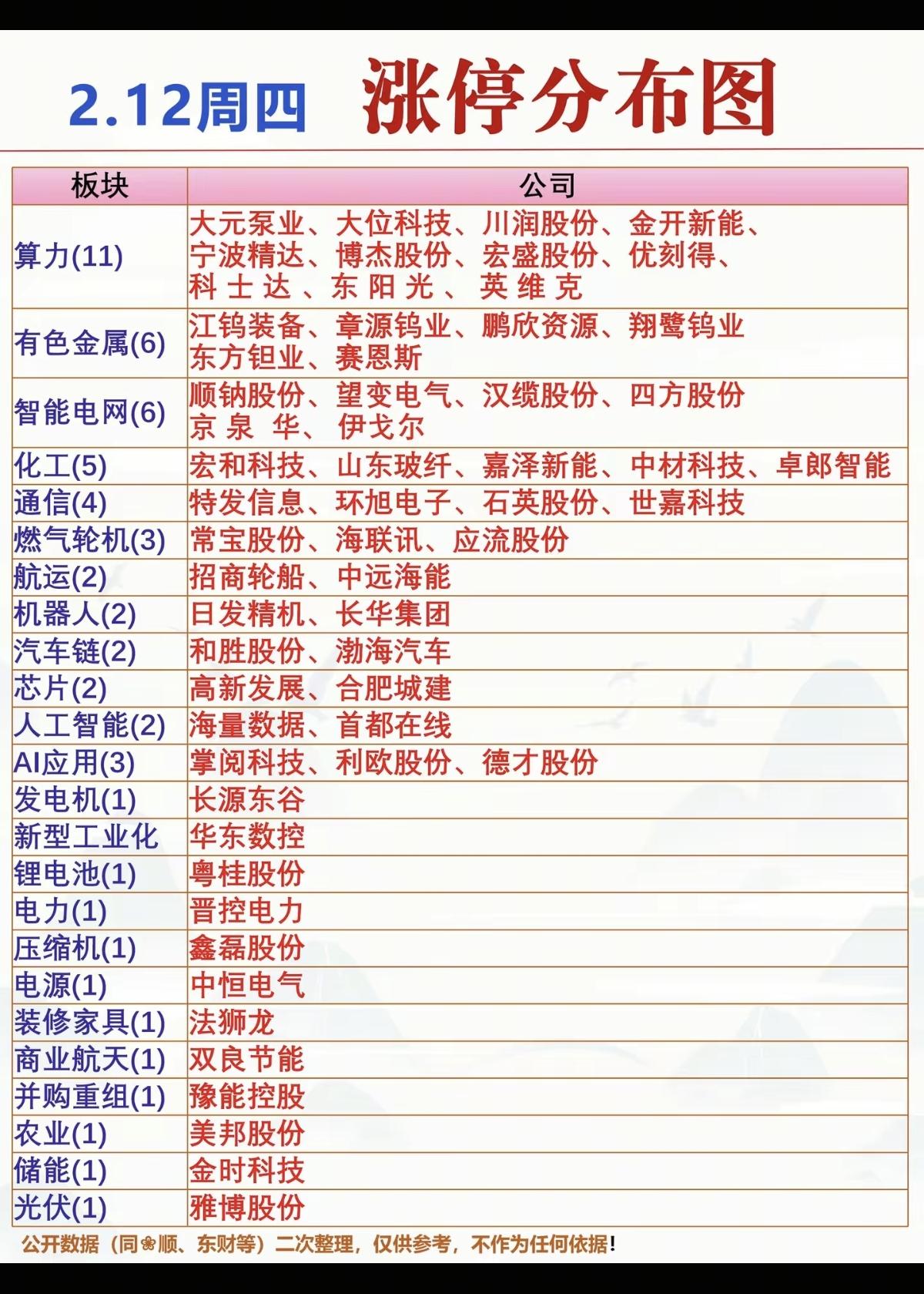 2.12周四 涨停板股票:题材+高度! 智能电网 4股涨停 液冷IDC 10股涨停 算力硬件 11股涨停 玻璃玻纤 5股涨停 光通信 4股涨停 有色金属 6股涨停