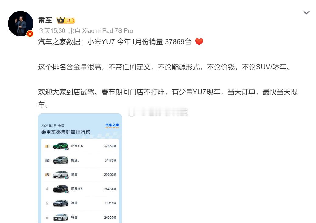 雷军同步晒出官方数据,小米YU7在1月卖出37869台实打实的销量摆在这不用多解释