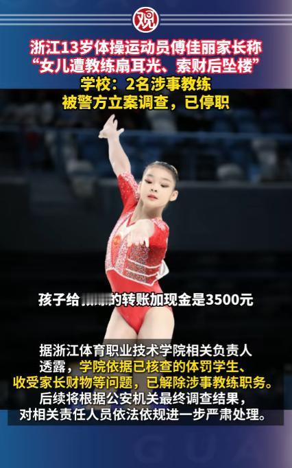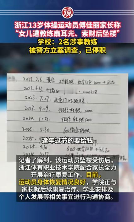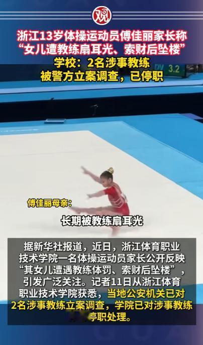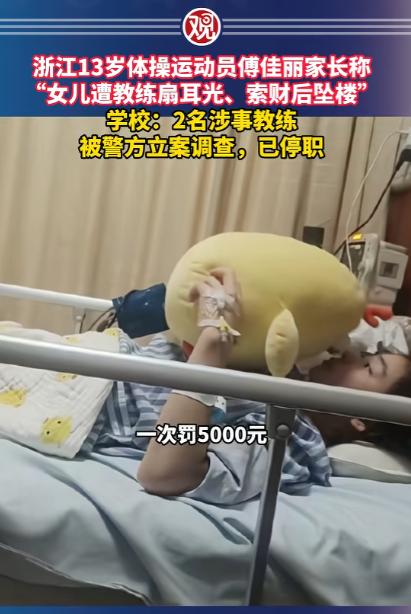 浙江杭州,13岁体操运动员傅佳丽母亲实名举报浙某体校教练唐某和施某,两位教练在训练过程中,不仅对运动员辱骂和扇耳光,还私自罚款。导致女儿不堪忍受折磨,从宿舍4楼跳下身受重伤,至今仍在治疗,留下严重后遗症。 在浙江杭州的专业体操训练场上,曾有一个 13 岁的女孩日复一日地在平衡木、自由操场地里反复打磨动作,她本该沿着职业运动员的道路一步步走向更高的赛场,却在一场突如其来的绝望抉择后,从体校宿舍的四楼纵身跳下,把原本闪闪发光的体操梦摔得面目全非。 傅佳丽的母亲在举报中完整讲述了孩子的遭遇,女儿在学校接受体操专业训练的过程中,长期受到教练唐某和施某的不当对待。 训练场上没有耐心的指导和正向的鼓励,只要动作出现失误、没能达到教练设定的要求,迎来的不是针对性的技术纠正,而是刺耳的言语辱骂和直接的扇耳光,这样的肢体与精神双重伤害,并非偶尔的严厉惩戒,而是贯穿日常训练的常态。 对于一个还处于青春期的孩子来说,专业体操训练的高强度与高难度本就需要强大的心理支撑,可傅佳丽每天不仅要面对训练的压力,还要时刻活在被打骂的恐惧里,长期的精神紧绷让她越来越沉默,原本对体操的热爱也被一点点消磨。 比言语羞辱和肢体体罚更让家庭难以承受的,是两位教练私自设立的罚款名目和反复索要的财物。教练会以训练不达标、违反队内规定等各种理由,对傅佳丽进行私自罚款。 单次罚款金额直接高达 5000 元,这对于一个普通家庭而言,是一笔不小的经济负担,除了随机的罚款,逢年过节时,两位教练还会以暗示或直接要求的方式索要红包。 家长为了让孩子能在体校正常训练、不被区别对待,只能一次次妥协,通过线上转账等方式满足对方的要求。 据家属整理的凭证统计,前前后后转给两位教练的金额累计超过四万元,每一笔支出都成了压在孩子和家长心头的沉重石头,也让原本纯粹的体育训练,蒙上了利益索要的阴霾。 长期的打骂体罚、无底线的钱财索要,让年仅 13 岁的傅佳丽承受着远超年龄的身心压力,她不敢把完整的遭遇告诉家人,也找不到合适的方式排解情绪,在日复一日的压抑与恐惧中,最终做出了极端的选择。 2025 年 11 月的一天,傅佳丽从体校宿舍四楼跳下,身体遭受了严重创伤,经过医院的紧急抢救,孩子的生命得以保住,却留下了明显的后遗症,至今仍在医院接受系统的康复治疗。 曾经能轻松完成高难度体操动作的小将,如今只能躺在病床上忍受伤痛,原本清晰的职业运动道路,也因为这场意外彻底中断,家人看着孩子被伤痛折磨的模样,满心都是心疼与无力。 从孩子出事到选择公开举报,傅佳丽的母亲走过了 77 天的维权之路,她没有采取过激的方式,而是默默收集了聊天记录、银行转账凭证、医院验伤报告、相关录音以及同期运动员的证人证言,把完整的证据链整理清晰后进行实名举报。 这位母亲的诉求格外简单,她没有提出高额的赔偿要求,只希望涉事的体校和两位教练,能正视自身的错误行为。 向受伤的孩子和备受煎熬的家庭正式道歉,给公众一个透明公正的交代,也让更多和傅佳丽一样怀揣体育梦想的孩子,能远离伤害,在安全的环境里坚持热爱。 事件被公开后,相关部门和涉事单位迅速做出回应,当地体育局第一时间发布消息,称已经成立专项核查小组,对举报涉及的体罚、罚款、索要财物等内容展开全面细致的核实,会严格遵循流程推进调查,确保不遗漏任何关键细节。 当地警方也同步介入案件,针对教练涉嫌体罚、勒索财物等行为开展依法取证与侦查工作,全力维护未成年人的合法权益。 目前两名涉事教练唐某和施某已被警方正式立案调查,学校第一时间对二人做出停职处理,傅佳丽的身体恢复情况较为平稳,正在积极配合医护人员的康复治疗。 体操是我国传统的优势竞技项目,每年都有无数少年儿童怀揣着赛场梦想进入体校接受专业训练,他们是国家体育事业的后备人才,更是需要被重点保护的未成年人。 此次事件让大众把目光聚焦到青少年体育训练的监管环节,专业竞技训练追求成绩与突破的同时,绝不能以牺牲孩子的身心健康为代价。 体校作为培养体育人才的核心场所,理应完善教练员的招聘、考核与日常监督机制,从源头杜绝体罚、勒索等违规行为,给小运动员们搭建一个充满尊重、安全可靠的训练环境。 青少年是体育事业的未来,更是社会的希望,无论是专业体校还是一线教练员,都应该守住保护未成年人的底线,让体育训练回归纯粹的本质。 让每一个怀揣运动梦想的孩子,都能在阳光下勇敢奔跑、安心成长,不用再承受不该有的伤害与重压,让每一份热爱都能被温柔以待。 对于这件事,您有什么想说的吗?欢迎评论区留言讨论。 信源:观察者网2026-02-12——《浙江13岁体操运动员傅佳丽家长称“女儿遭教练扇耳光、索财后坠楼”,学校:2名涉事教练被警方立案调查,已停职》