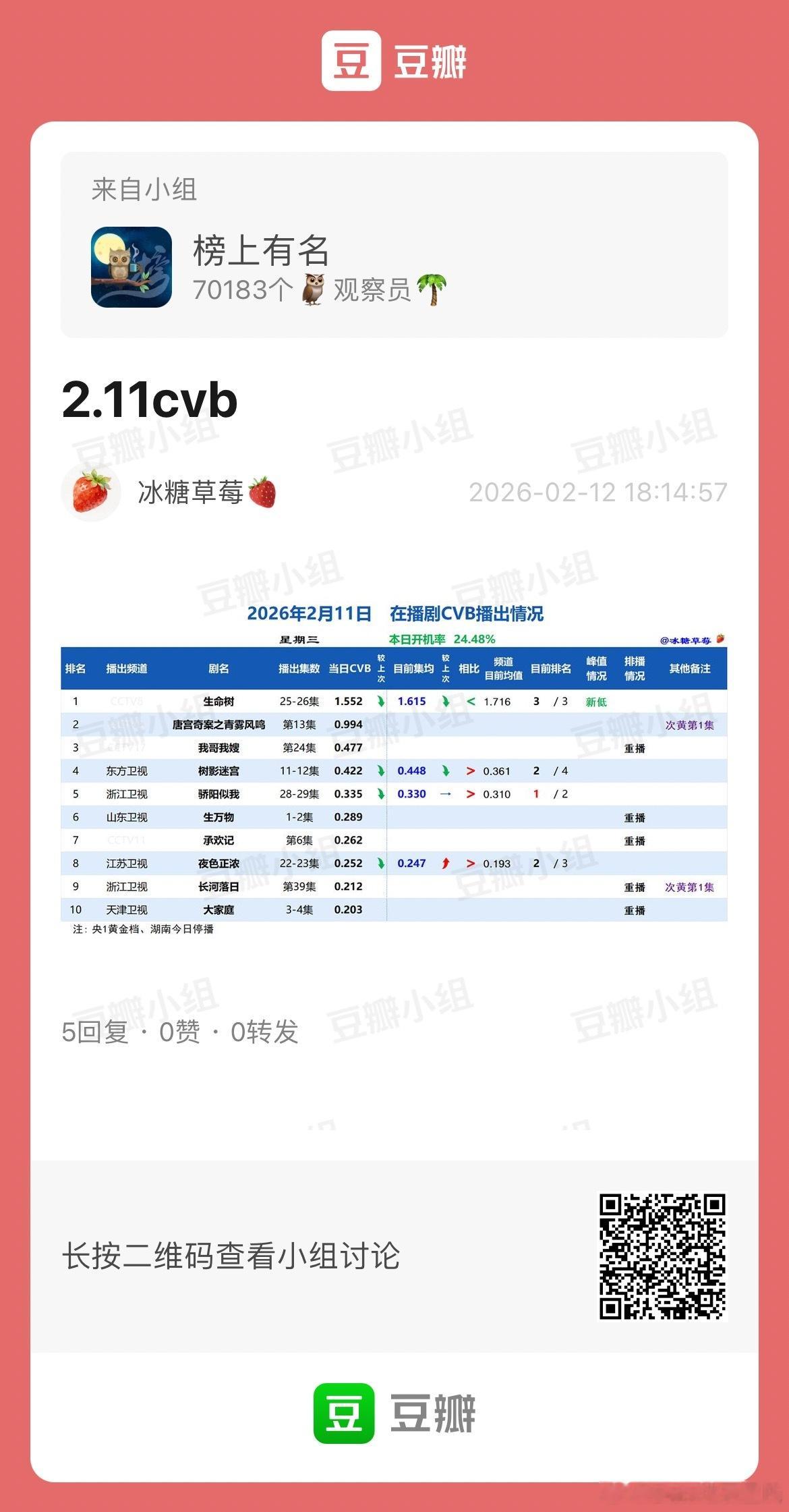 2.11CVB收视率,日榜&集均生命树 1.552%,又双叒叕新低了生命树下篇狂