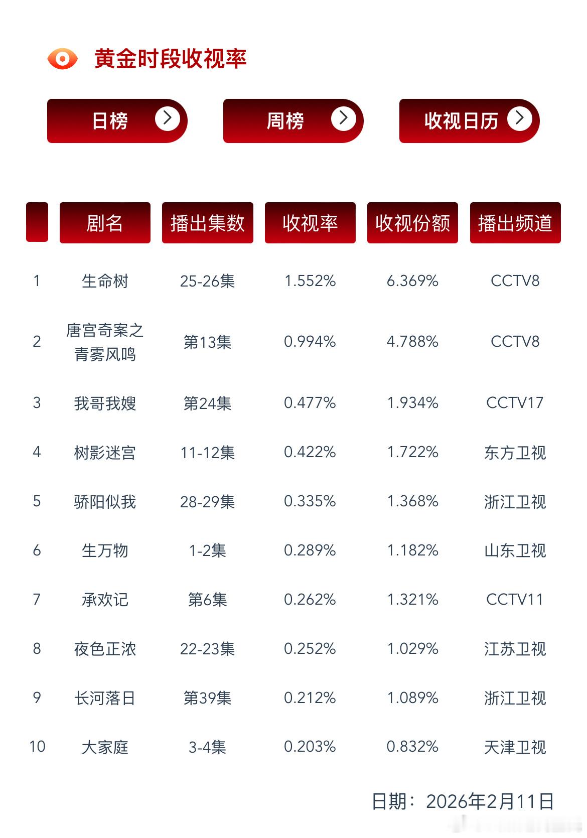 2.11CVB收视率,日榜&集均生命树 1.552%,又双叒叕新低了
