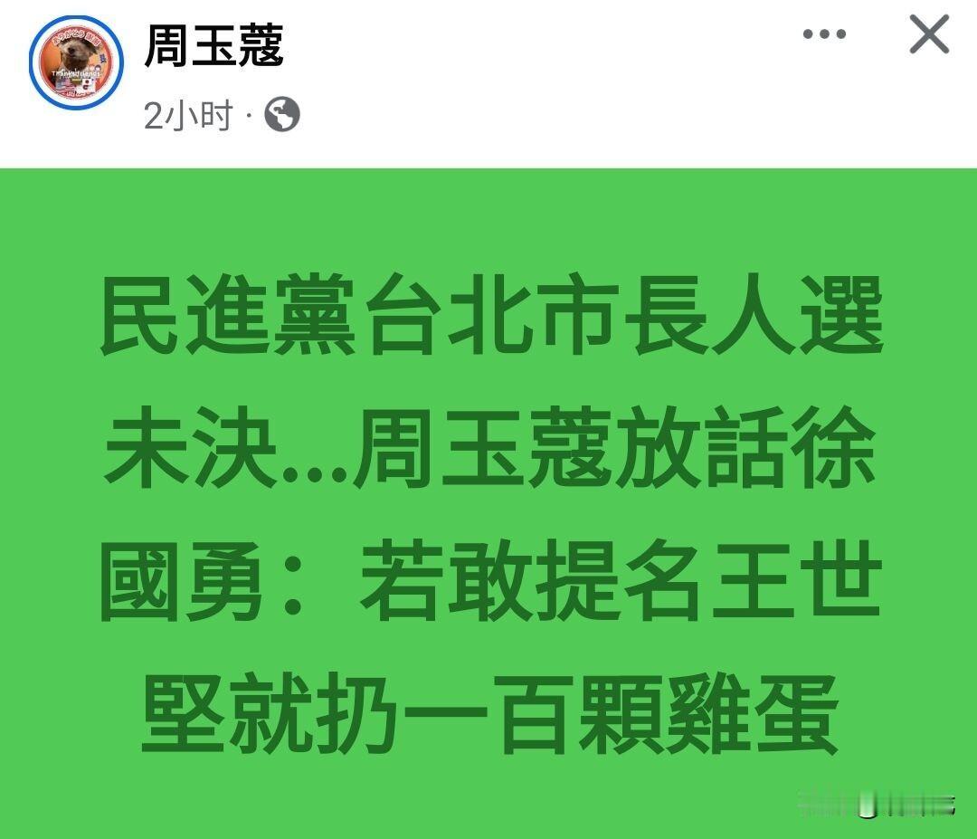 周玉蔻对徐国勇放话:民进党新北市长人选若敢提名王世坚,就扔100颗🥚鸡蛋。 周玉蔻和王世坚一直以来都有矛盾,隔空互骂过多次,近日这二人又因为高金素梅被带走调查一事而吵了起来,王世坚在媒体面前力挺高金素梅,周玉蔻就逮住这个机会不放,接连发贴文骂王世坚,周玉蔻还自诩是“正义女战神”,骂王世坚“眼睛糊到蜊仔肉,民进党有这样的立委真丢人”,王世坚也没有惯着她,在媒体面前做出反击:“有个高龄长者带扫把的攻击我,莫名其妙,我怀疑党内有人给她扫把。” 今天(2月12号)周玉蔻再发文回应,先是说王世坚胡言乱语骂她,还称王世坚口不择言,未战先降,然后又向徐国勇喊话,如果民进党胆敢在新北市长人选提名王世坚,就丢100颗鸡蛋。 两位绿营人士这样互骂对蓝营来说反而是好事,民进党在新北市长的人选如果提名王世坚,后续周玉蔻一定会持续发力怒呛民进党和王世坚,他们绿营内部先吵起来,如果民进党没有提名王世坚,提名其他人的话,那么赢的概率实在太低,所以周玉蔻和王世坚这样吵起来对蓝营有利。