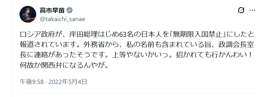 “据报道,俄罗斯政府已对包括岸田首相在内的63名日本人实施“无限期入境禁止”。外务省方面表示,据说名单中也包括我的名字,并已联系了政调会室长。行啊你?就算邀请,老娘也不会去的!怎么不知不觉说成关西腔了呢。”