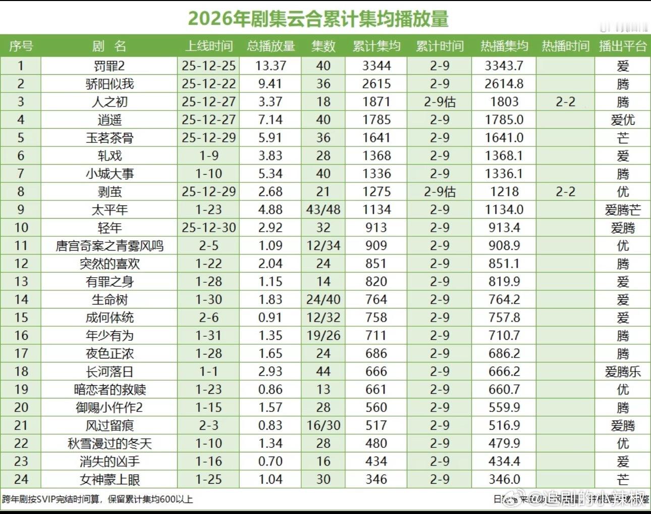 26年最新热播集均统计,看了有点伤,现在好像大家播的都蛮难的