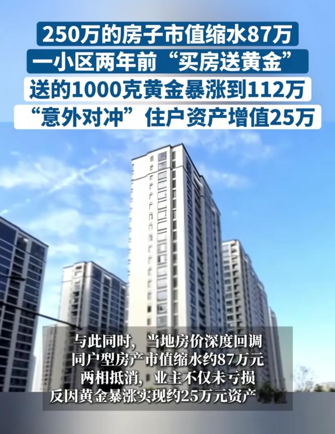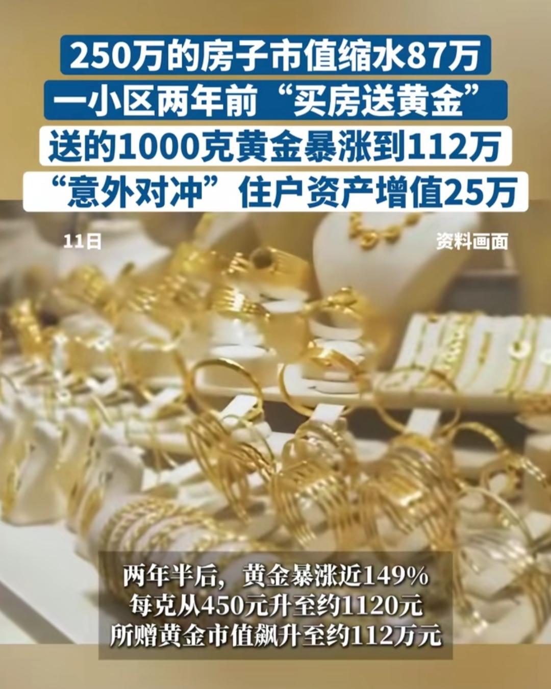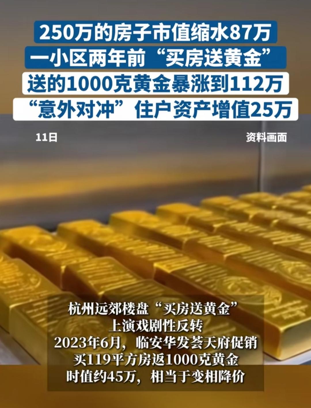 谁能想到买房的意外惊喜,居然藏在附赠的黄金里!两年前杭州临安一楼盘搞买房送黄金,119平的房子直接送1000克黄金,当时看着是个诱人的促销,谁也没把这黄金当回事,如今却成了神来之笔。 原本250万的房子,两年时间市值直接缩水87万,跌到163万,搁谁心里都得犯堵,买房的喜悦早被资产缩水的糟心冲没了。本以为是妥妥的亏了,转头一看附赠的黄金,身价却一路猛涨。 当初约45万的1000克黄金,现在涨到了112万,算下来房子亏的钱,黄金不仅全补上,还倒赚25万。这波操作属实意外,买房的初衷是安家,反倒无意间实现了资产对冲,躲过了单一资产贬值的坑,现实真的比剧本还精彩啊!