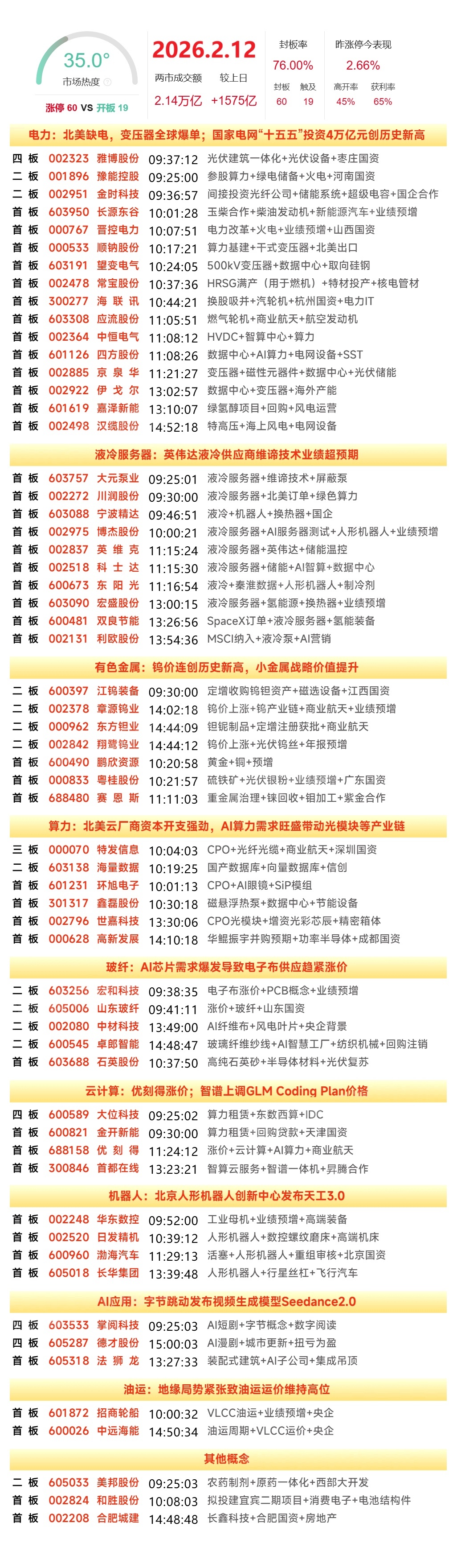 2月12日A股涨停个股与板块分析