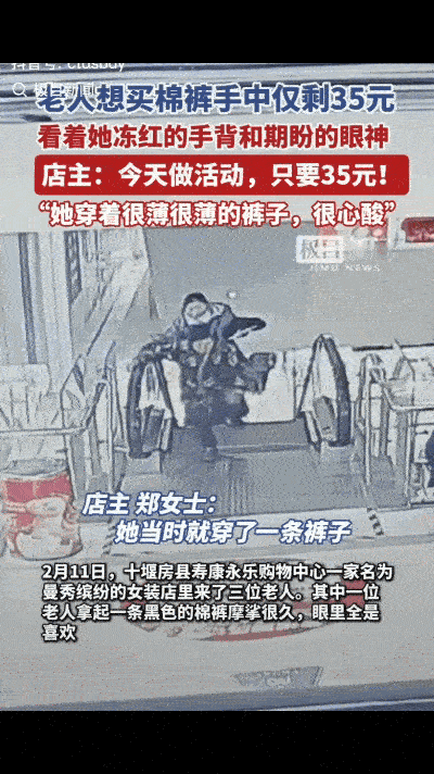 泪目!一家女装店店主正在店里,来了三位老人,店主开始以为老人是来逛街看衣服的,不料,其中一老人拿起一条加绒黑裤,反复抚摸着不愿放下,店主见状,低声问:“喜欢,可以试试!”谁知,老人不好意思的笑着说:“我只有35元钱,够吗?”店主看了看老人的样子,接下来的行为让无数网友感叹:这世间,还是好人多! 老人说话时头埋得很低,冻得通红的手指紧紧攥着一叠皱巴巴的零钱,10元、5元、1元的纸币混着几枚硬币,被捂得温热。同行的两位老姐妹站在一旁,身上的外套洗得发白,衣角磨出了毛边,她们不敢插话,只是满眼局促地看着店主。这条加绒黑裤是冬季加厚款,内里绒料密实保暖,门店标价199元,进货成本都要80多元,35元连成本的一半都不到,店主心里比谁都清楚。 她没有报出原价,也没有露出半分为难的神情,目光落在老人单薄的裤子上,裤腿薄得能透出里面的秋裤,腊月的寒风里,老人的腿早就冻得打颤。老人是独居低保户,一个月的生活费不过百余元,这条保暖裤不是追求时髦,是过冬的必需品。店主想起自己年迈的父母,鼻尖一酸,当下就做了决定。 她接过老人手里的裤子,利落地叠好装进干净的塑料袋,笑着递过去,轻声说今天店里做活动,这条裤子刚好35元。老人愣在原地,反复确认了两遍,确认自己没听错后,眼眶瞬间红了,颤巍巍地把钱递过去,连声道谢,声音哽咽得说不出完整的话。三位老人拎着裤子慢慢走出店门,走几步就回头挥手,佝偻的身影在寒风里,却透着藏不住的暖意。 这一幕被路人随手拍下传到网上,短短一天就收获百万点赞,评论区里满是破防的留言。有人说自己的奶奶也是这样,一辈子省吃俭用,手里攥着零钱买东西都要犹豫半天,把所有好东西都留给家人;有人说店主的善良从不是施舍,是悄悄护住老人的体面,用一句温柔的谎言,成全了老人最朴素的需求。 当下总有人说市井烟火里只剩利益计较,小本生意要扛房租、要付水电、要承担进货成本,每一分钱都赚得不容易。这位店主明明可以婉拒老人,明明可以守住成本不亏本,她却选择放下利益,接住了老人的窘迫。小店的生意本就平淡,这一单实打实赔了钱,可她事后接受采访时说,亏点钱不算什么,能帮到老人就值当。 老人的自尊同样让人动容,她没有伸手讨要,没有倚老卖老,只是坦诚说出自己仅有的钱,不卑不亢地面对生活的拮据。店主的善意与老人的自尊相互碰撞,才让这件小事有了直抵人心的力量。我们总在寻找人间温暖,却忽略了温暖从不在惊天动地的壮举里,就在这些街头巷尾的细碎瞬间里。 菜市场摊主多给老人一把青菜,公交司机多等几秒让老人坐稳,便利店老板给晚归的人留一盏灯,这些不起眼的小事,拼凑起最真实的人间美好。这件事之所以能戳中无数人,是因为它让我们看见,普通人心里的温柔与善良,从来都没有被生活磨平。 一条加绒裤暖的不只是老人的双腿,更是无数人对生活的期待。店主的一个小举动,唤醒了大家对善意的感知,也让更多人愿意在日常里,多一份体谅,多一份温柔。这世间的美好,从来都由这些平凡的善意堆砌而成。 各位读者你们怎么看?欢迎在评论区讨论。