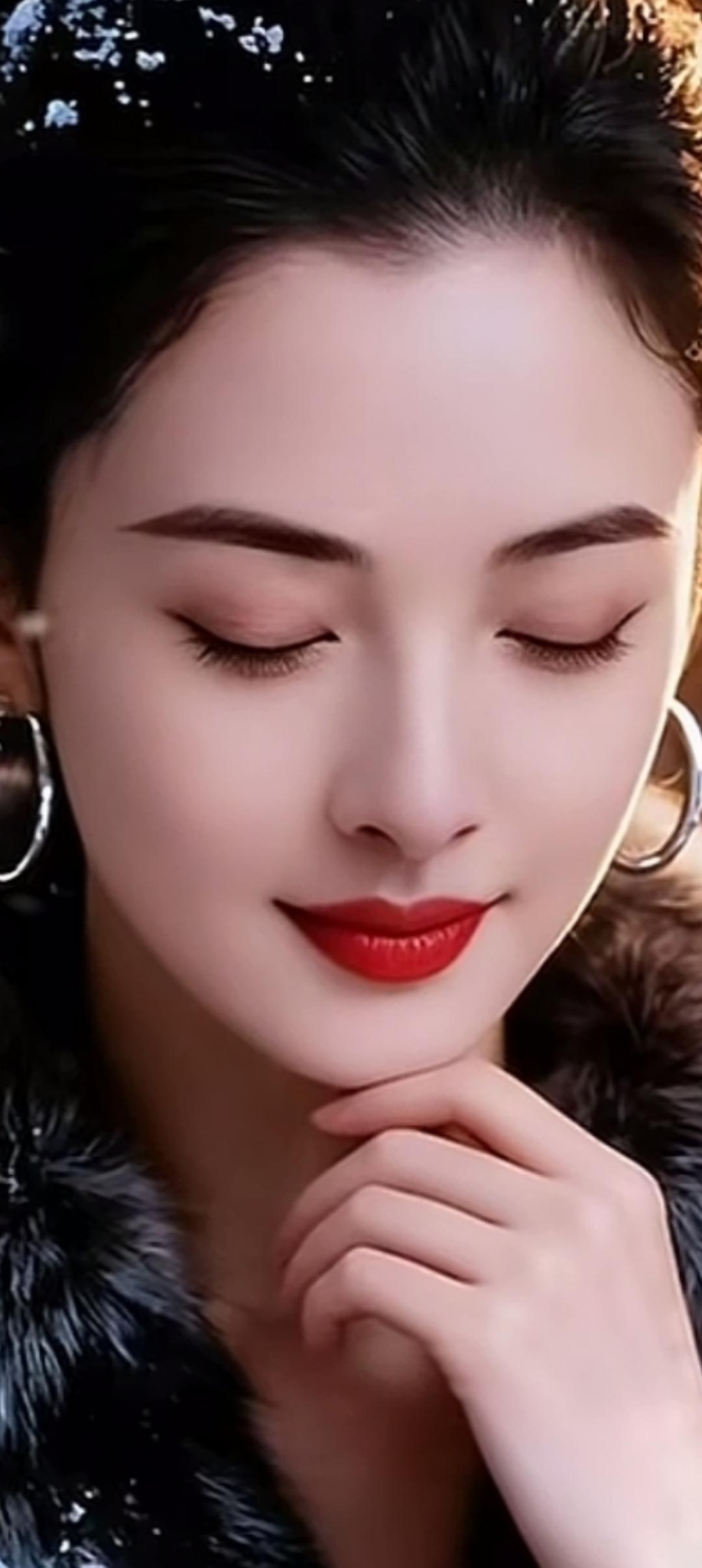 冬日暖阳下的温柔微笑,红唇与雪白肌肤的完美碰撞。
