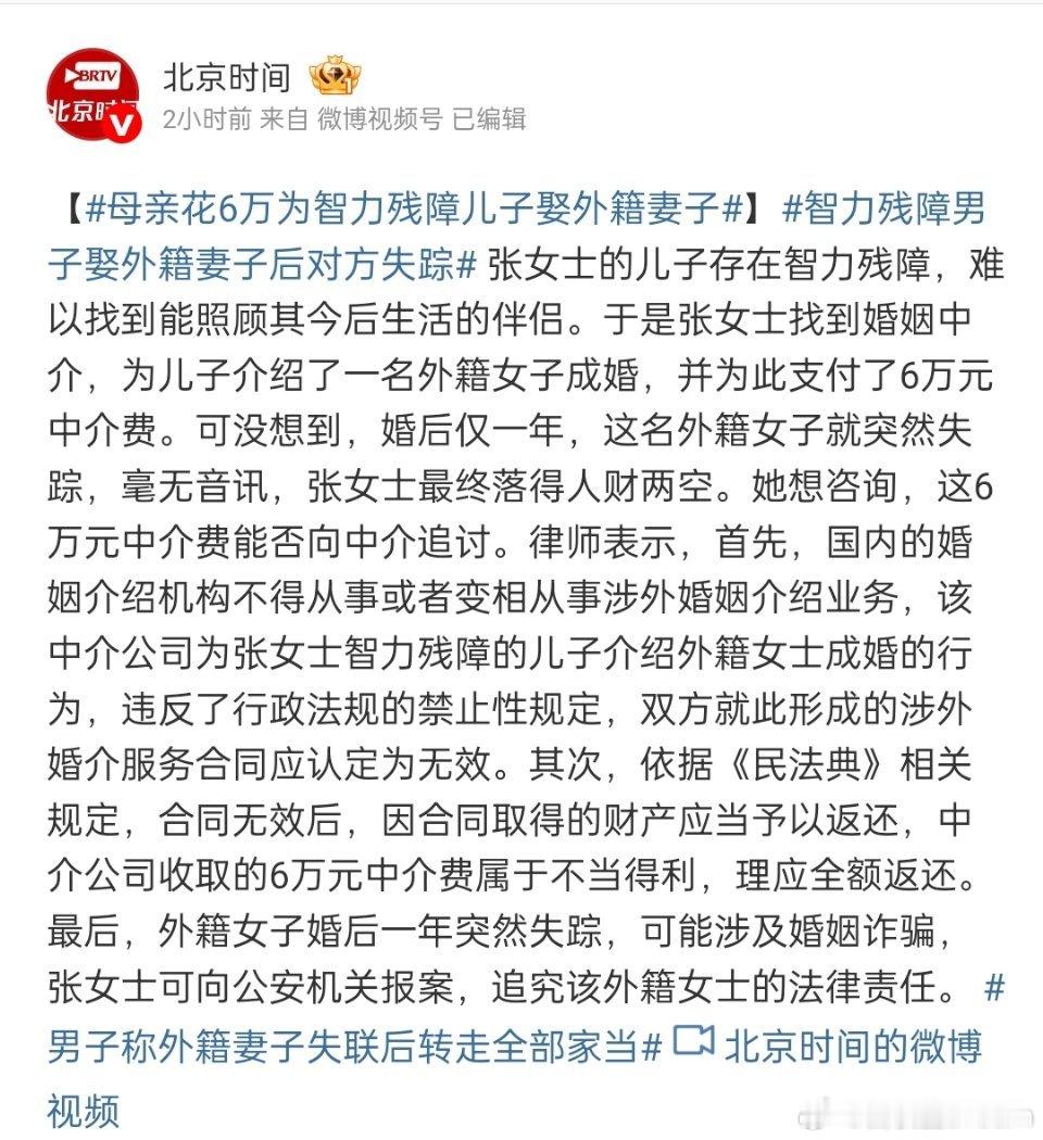 母亲花6万为智力残障儿子娶外籍妻子这个案件其实挺有意思的。男方娶外籍妻子。这个涉外婚介合同是无效的,6万中介费属于不当得利,可以全额返还。而且女方涉及婚姻诈骗,还可以报案。跨国婚姻的普法,媒体可以多报道一下,很多人对这方面是有误解的。