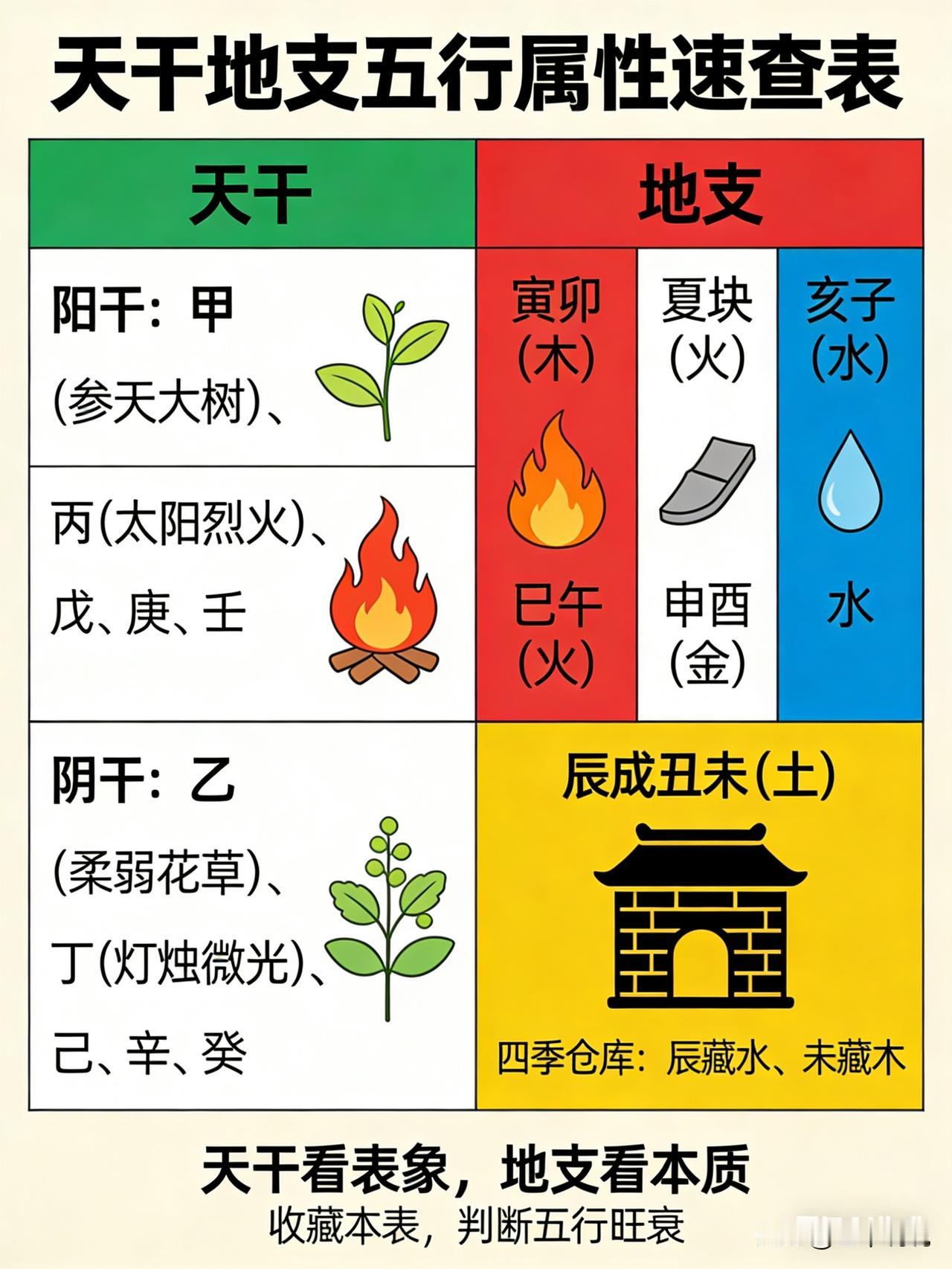 天干地支如何对应五行?大白话一次讲透 上一篇我们说了,八字是由天干地支组成的“时空密码”。今天是最核心的一步:给这些干支“贴标签”,也就是看懂它们的五行属性。 记住一个核心规律:天干看表象,地支看本质。 先说天干,它是一对一的关系。甲是参天大树,乙是柔弱花草,这都属木;丙是太阳烈火,丁是灯烛微光,这都属火。记住“甲丙戊庚壬”为阳,“乙丁己辛癸”为阴,你就懂了性格的刚柔之分。 再看地支,它是八字的根基。寅卯属木对应春天,巳午属火对应夏天,申酉属金对应秋天,亥子属水对应冬天。 这里有个难点:辰戌丑未这四个“土”。它们是四季的“仓库”,比如辰土里藏着水,未土里藏着木。土主包容,所以这四个地支在八字里最擅长“转化能量”。 收藏这张表,下次拿到八字,你就能自己判断五行旺衰了!感兴趣的朋友关注我,一起探讨如何根据五行缺旺,找到自己的人生优势或短板,顺势而为。