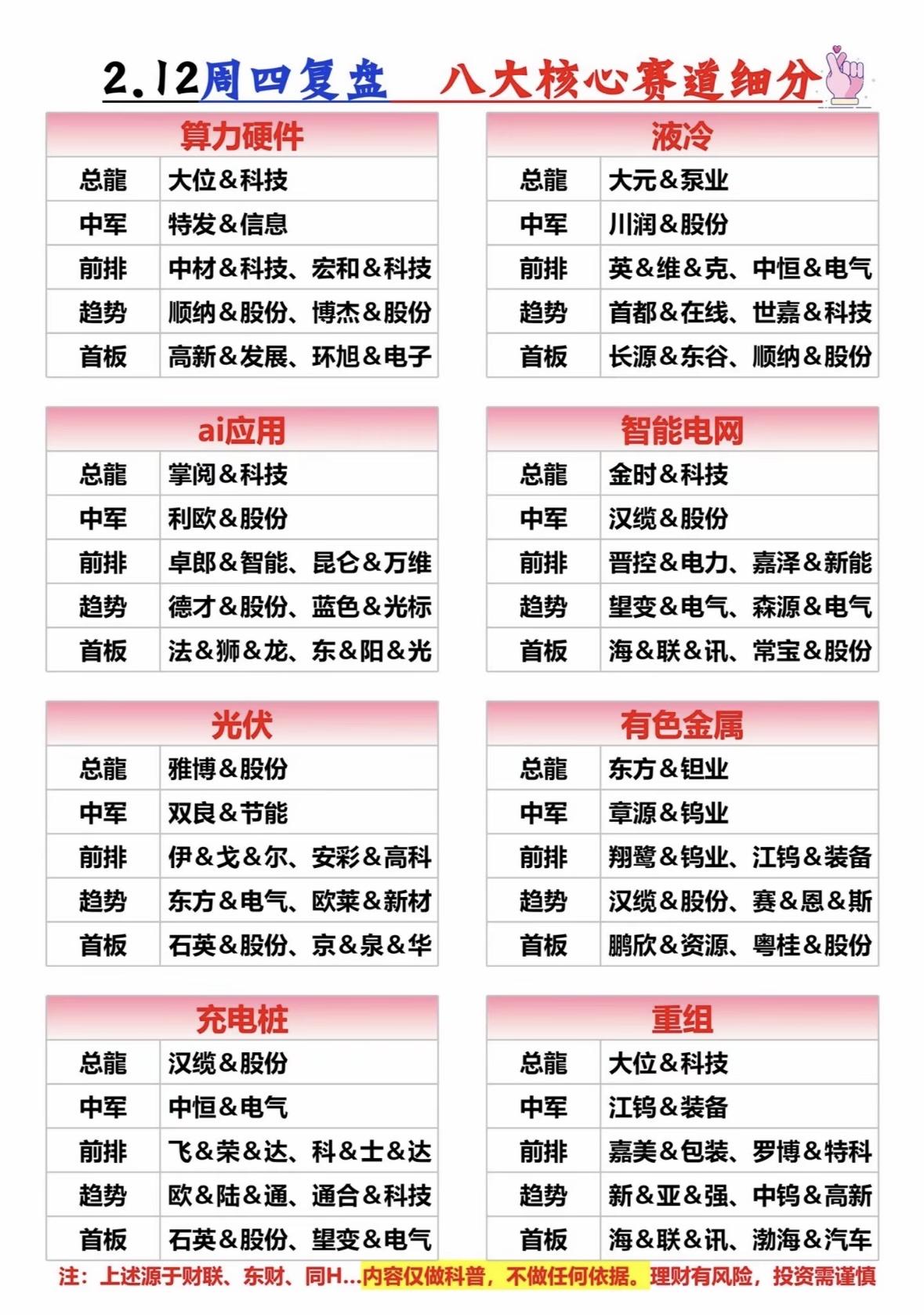 2.12周四复盘八大核心赛道细分 八大核心赛道热股盘点:算力、光伏、有色领涨,液冷、智能电网、充电桩活跃,重组概念受关注