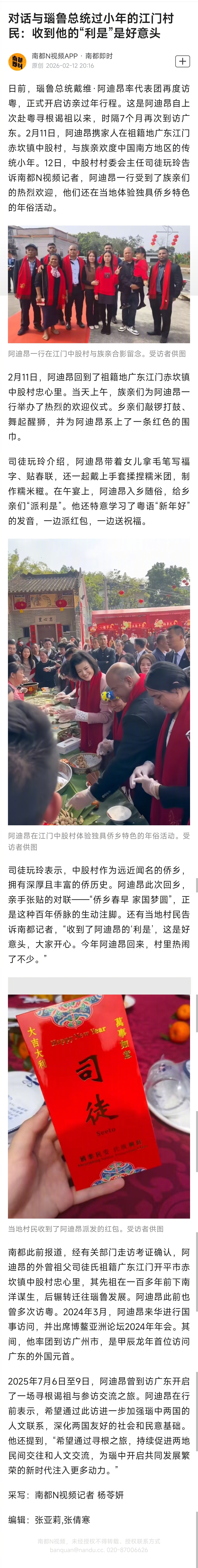 【#对话与瑙鲁总统过小年的江门村民#:收到他的“利是”是好意头】日前,瑙鲁总统戴维·阿迪昂率代表团再度访粤,正式开启访亲过年行程。这是阿迪昂自上次赴粤寻根谒祖以来,时隔7个月再次到访广东。2月11日,阿迪昂携家人在祖籍地广东江门赤坎镇中股村,与族亲欢度中国南方地区的传统小年。12日,中股村村委会主任司徒玩玲告诉南都N视频记者,阿迪昂一行受到了族亲们的热烈欢迎,他们还在当地体验独具侨乡特色的年俗活动。