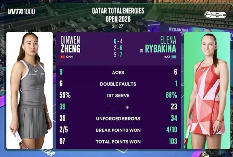 郑钦文vs莱巴金娜 6:4 2:6 5:7很强了! 前面都很主动,后面状态下滑,慢慢找回状态。第一盘的接发抢攻是top1级别的,进攻犀利,放小球肉眼可见进步!只是这种状态没能保持住,第二盘过于着急,失误骤增!较顶尖水准不差气势,差在稳定性和调整能力!