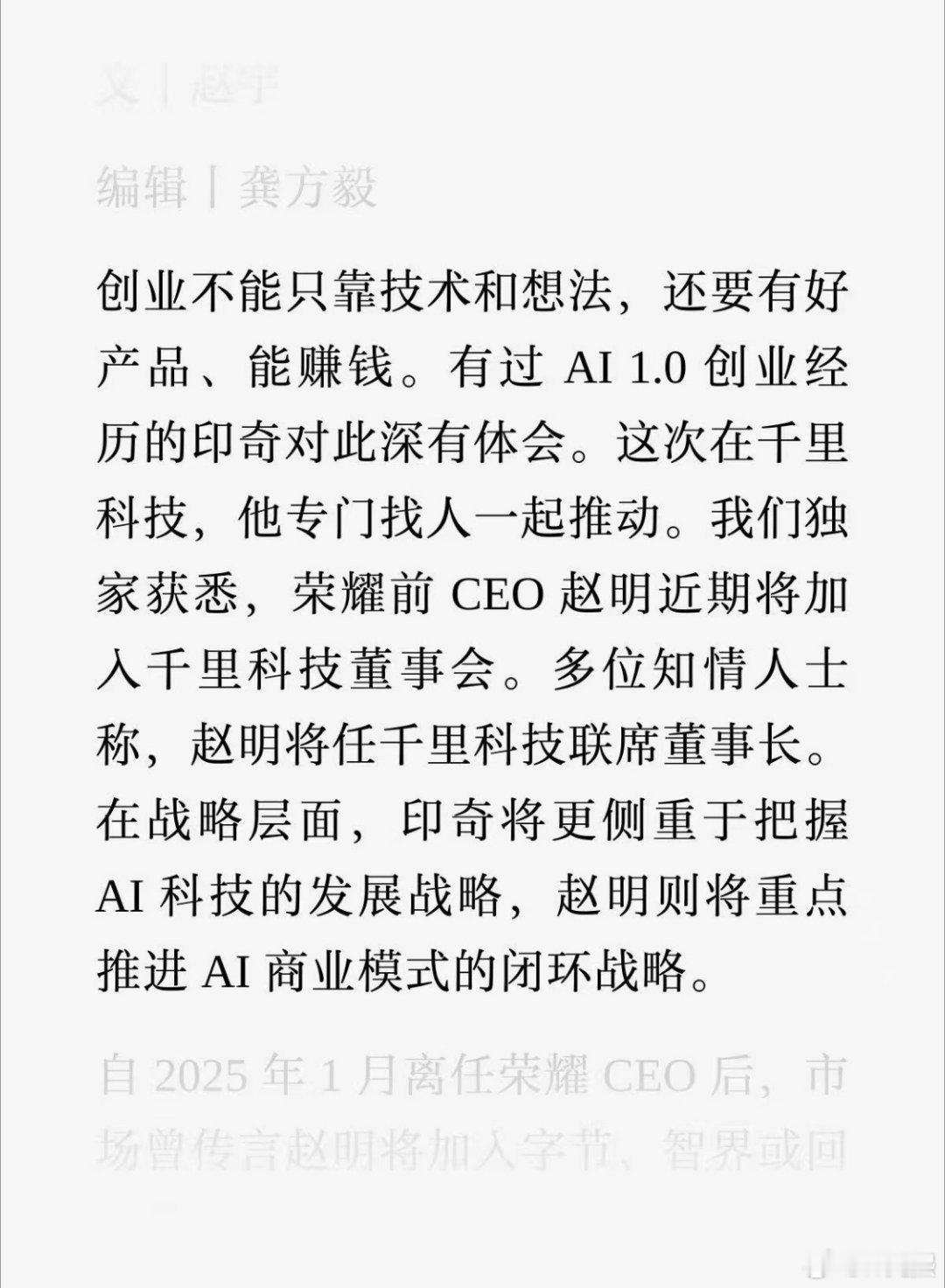 赵明加入千里科技沉寂一年的赵明,正式官宣加入千里科技出任联席董事长,未来将重点聚焦AI商业模式闭环战略,统筹技术变现、全球化品牌运营与全维度市场资源整合,把AI能力从技术研发推向规模化商业落地。这位在科技与产业界都颇具影响力的老将,隐退休整一年后并未淡出行业,而是选择加入吉利系重要布局——千里科技。该公司前身为力帆科技,吉利是其关键战略投资方,经过一系列资源整合与业务升级,如今已成为吉利在智能化赛道的核心载体。可以预见,接下来吉利体系内从智能驾驶、车载AI到全域智能化的技术输出与商业落地,很大程度上将以千里科技为核心平台。赵明的加入,无疑会加速吉利在AI与智能汽车生态的商业化步伐,一边夯实技术壁垒,一边打开全球化市场,一场围绕AI+汽车智能化的新布局正式拉开序幕。HOW I AI过个有AI年赵明加入千里科技