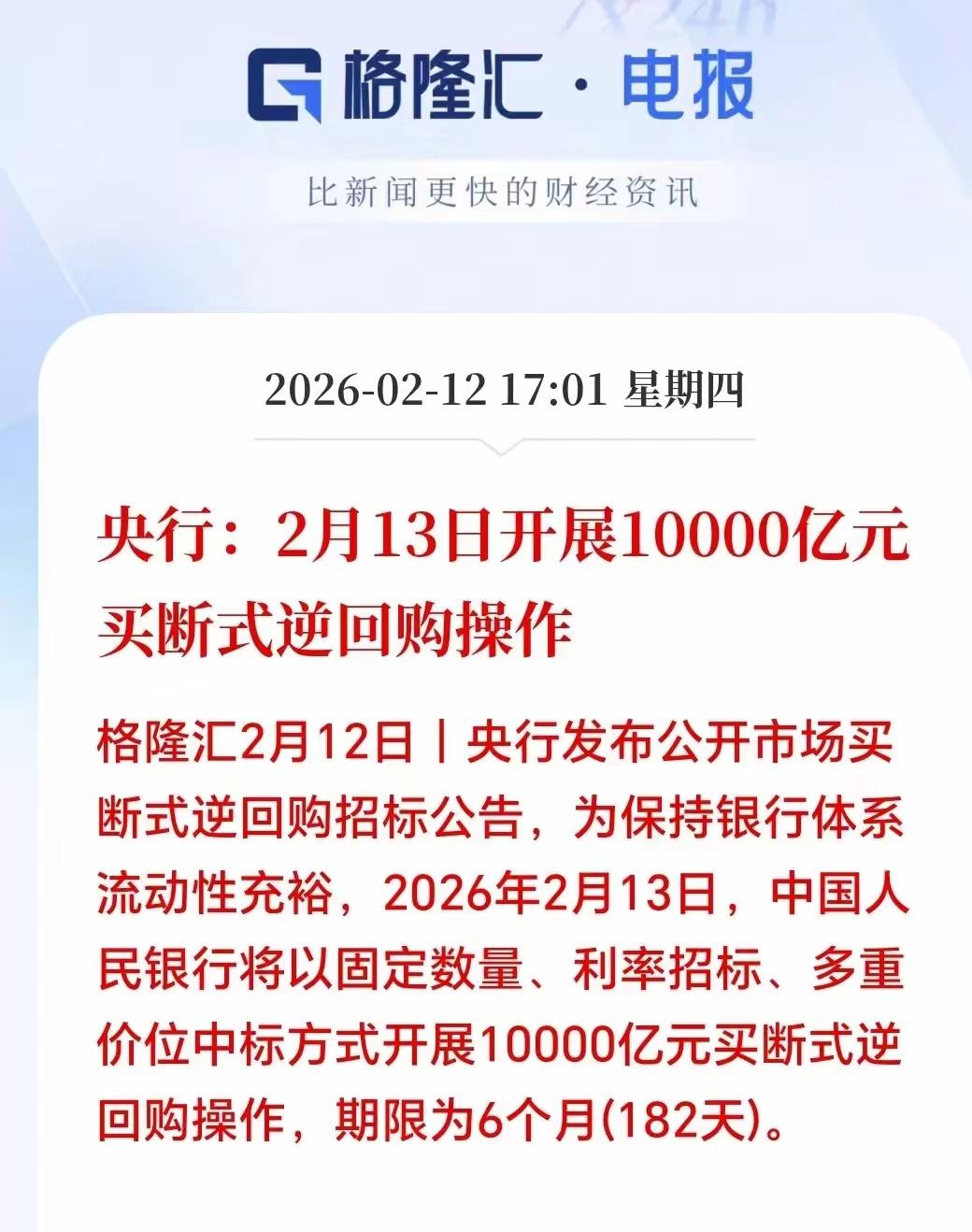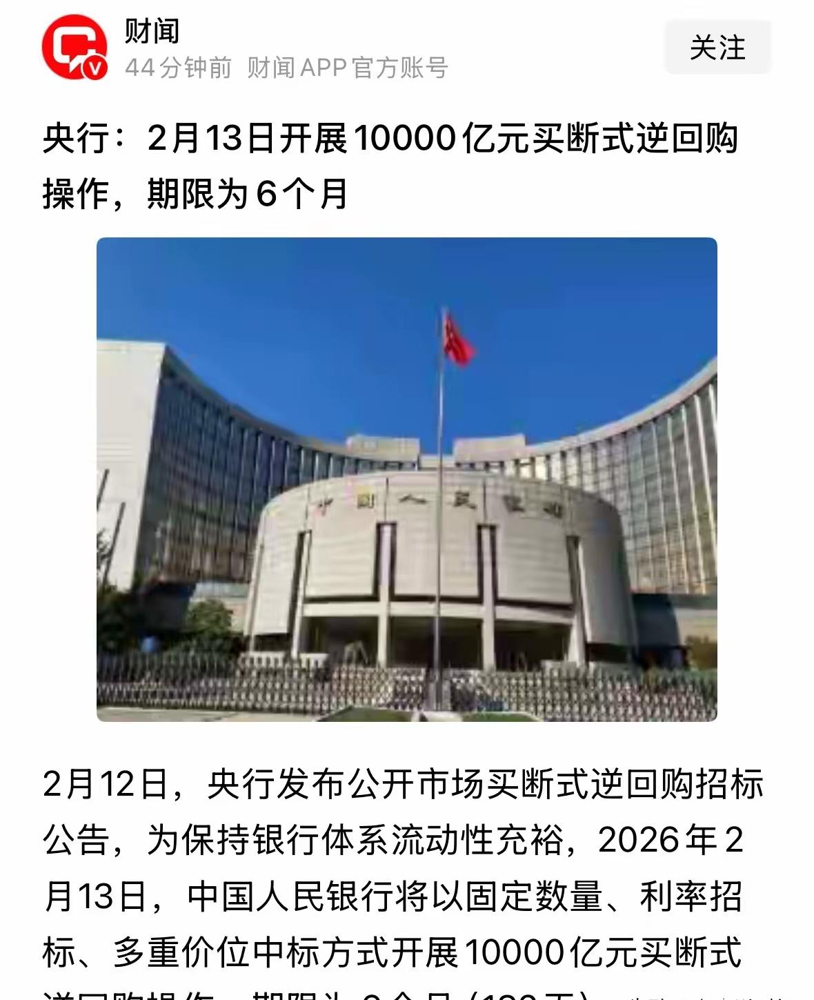 今天盘后,重磅利好消息。明天2月13号(周五),明天会不会,高开震荡走高,明天万亿资金增援战场。今天盘后央妈宣布,2月13日1万亿买断式逆回购,期限6个月,这也是为了保证流动性。对于市场,你们说,是不是利好。 央妈托底,资金面流动性宽松,央妈不差钱,这是市场的一剂强心针。大盘趋势非常好,今天又释放出万亿利好,明天会收红包吗?这就是一场及时雨。