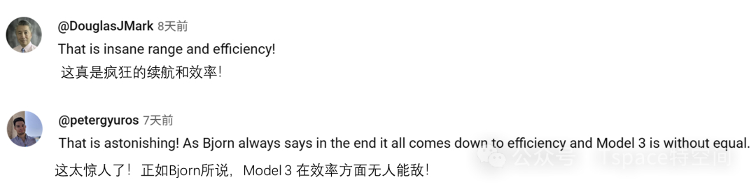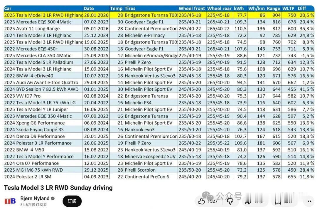 在视频结尾,Bjørn Nyland统计了自己评测过的纯电车型续航里程排名,直观呈现了在同样测试条件下,各车型续航表现与能耗的差异。