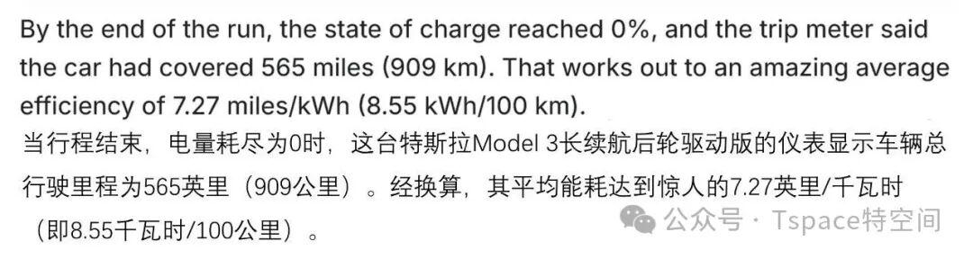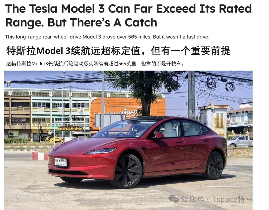 据外媒报道,一辆特斯拉Model 3长续航后轮驱动版在理想的实测条件下,跑出了565英里(约909公里)的续航里程,大幅超越官方标定续航。